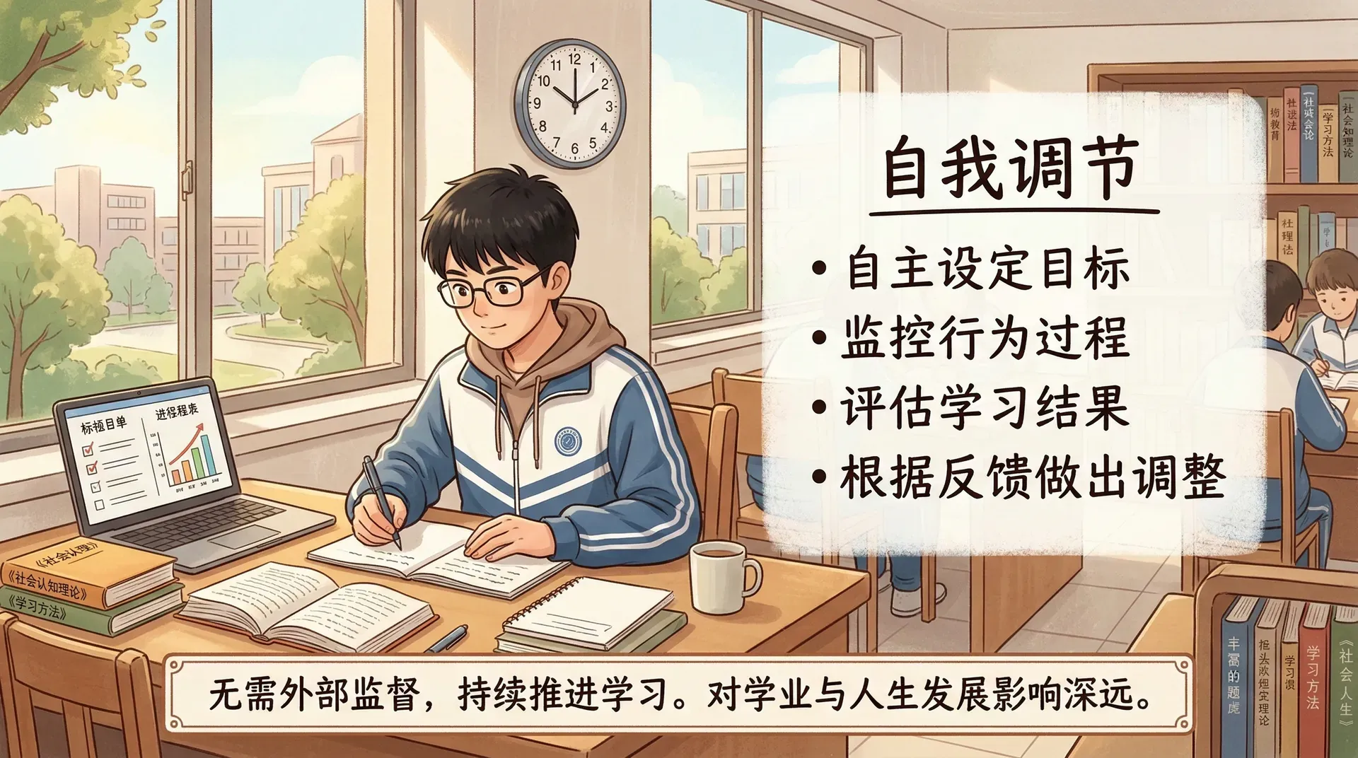 自我调节是社会认知学习理论中另一个核心概念,指个体能够自主地设定目标、监控行为过程、评估学习结果,并根据反馈做出调整的能力。一个具备良好自我调节能力的学生,不需要依赖外部的监督和催促,就能持续地推进自己的学习。这种能力的发展,对学业成就和长远的人生发展都有深远的影响。