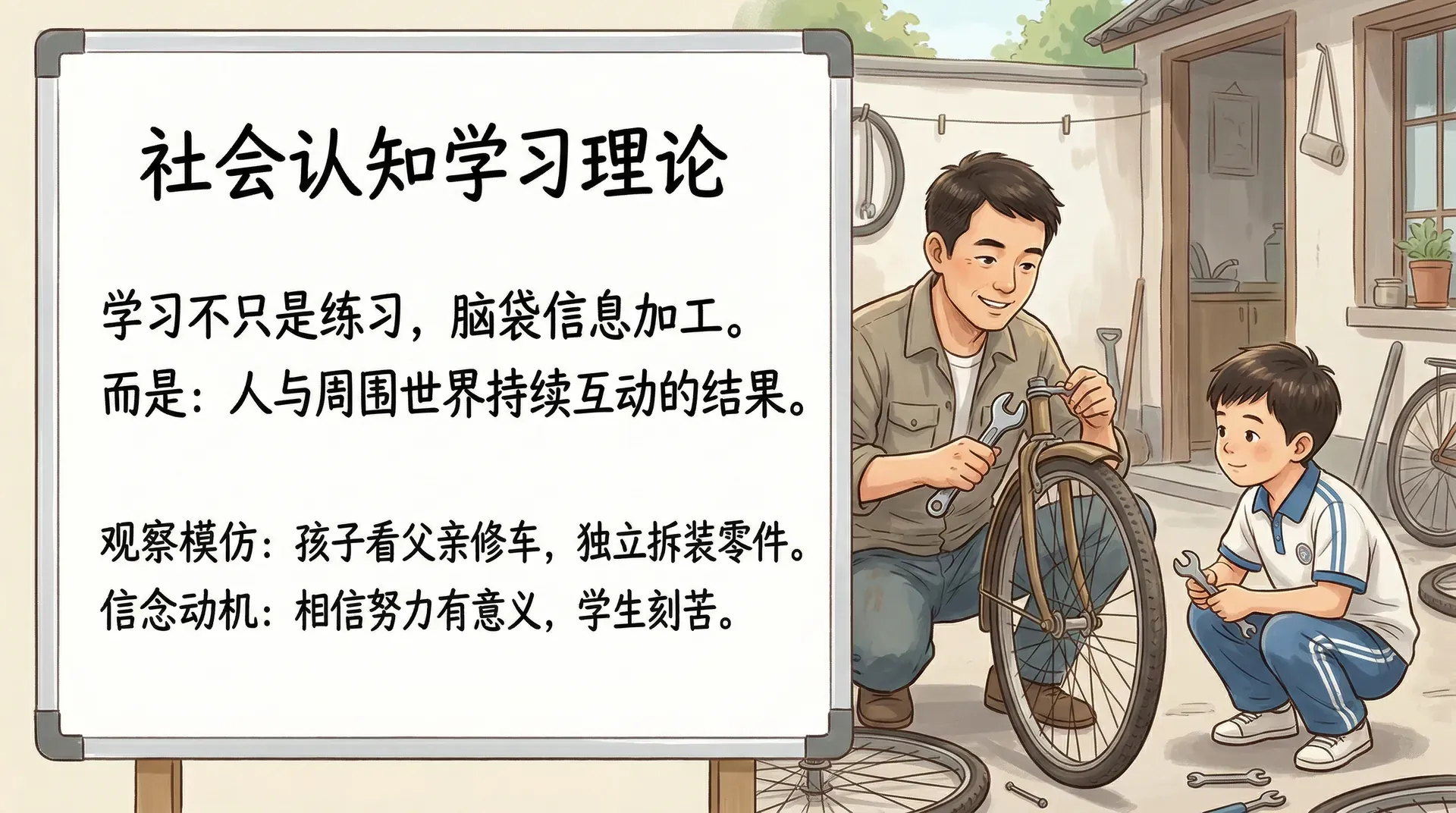 人为什么会学习?学习的发生靠的不只是反复练习,也不只是脑袋里的信息加工,更多时候,它是一个人与周围世界持续互动的结果。一个孩子在家里看父亲修自行车,渐渐地也能独立拆装零件;一个中学生在班级竞争氛围中越来越刻苦,不是因为有人督促,而是因为他开始相信努力是有意义的。这些日常现象背后,都有一套系统的理论在解释。