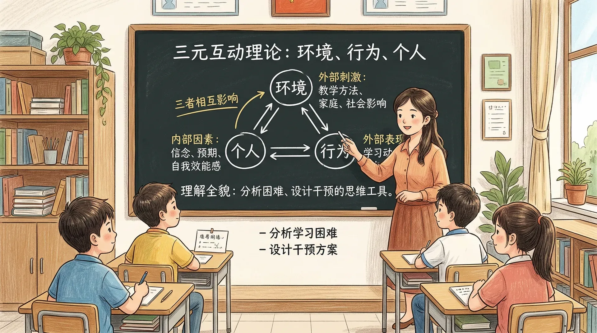 理解社会认知学习理论的全貌,最终需要回到它的核心架构——环境、行为与个人因素之间的三元互动关系。这个框架不只是一个抽象的模型,更是一套可以直接用来分析真实学习困难、设计有效干预方案的思维工具。