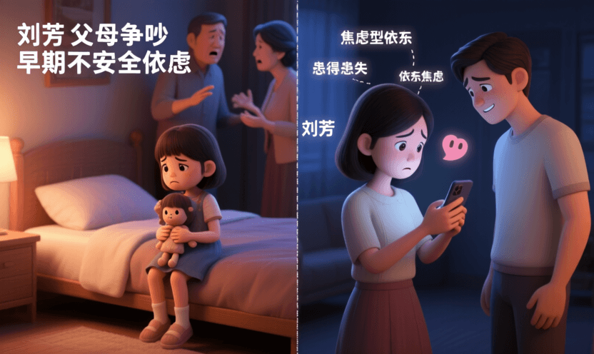刘婷小时母亲时常忽略她,导致她极度渴望关注。成年后的恋爱关系中,经常要男友确认爱意,容易制造冲突,几段感情均因此结束。遇到安全型伴侣后并通过心理咨询,她开始懂得以平静的方式表达需求,不再过度依赖确认。