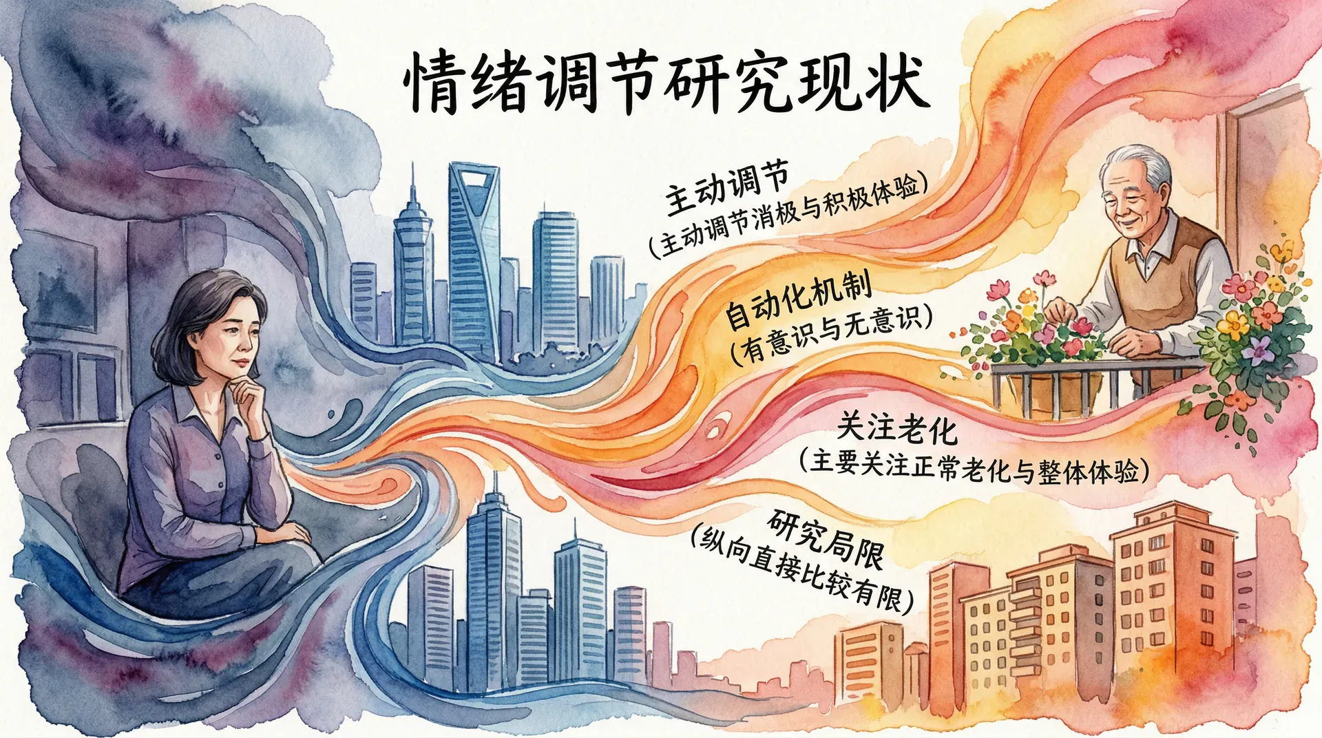 随着中国人口老龄化加速,情绪调节与老化研究在中国具有特殊意义。中国传统文化中的“老有所乐”、“颐养天年”等观念与现代情绪调节理论高度契合,为理解中国老年人情绪健康提供了独特视角。以下是几个值得深入探索的方向: