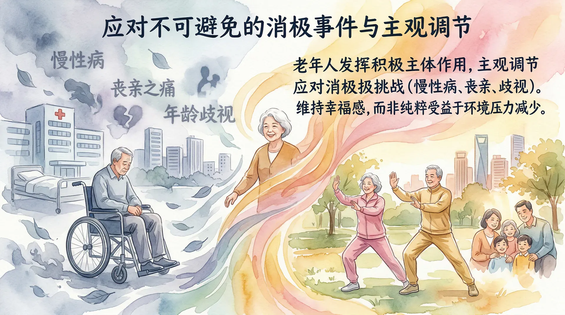 有研究者指出,老年人更大的幸福感,部分反映的是生活环境需求的年龄相关变化,而非纯粹的主观调节能力。子女养育责任结束和退休的到来,客观上减少了老年人生活中消极事件的频率。然而,老年人同样面临许多年轻人较少遇到的挑战,如慢性健康问题、丧亲之痛和年龄歧视。综合证据表明,老年人是影响自身幸福感的积极主体,并非仅仅受益于环境压力的减少。