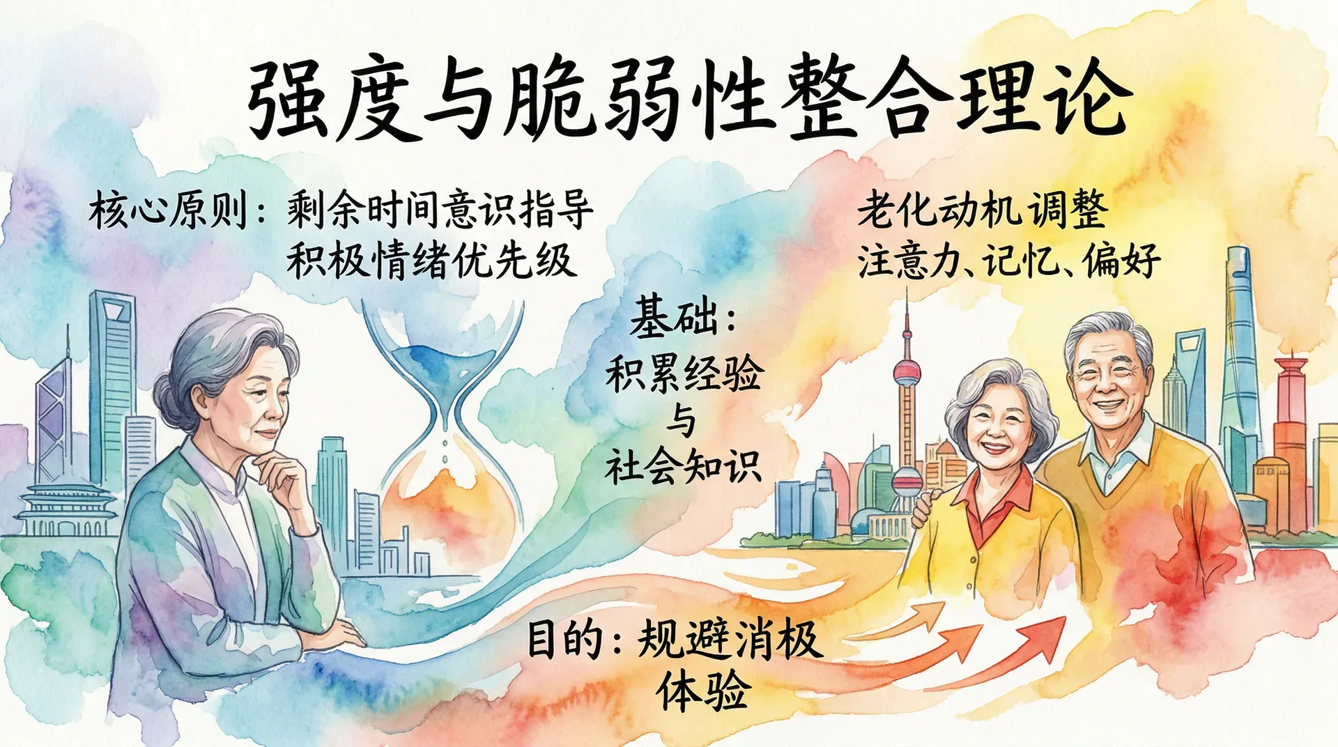 强度与脆弱性整合理论支持社会情绪选择性理论的核心原则:剩余时间意识指导优先级选择,使人们专注于积极情绪体验而非消极情绪。人们基于积累的自我认知、社会环境知识和人生经验来执行这些动机。老化伴随着有意识和无意识的动机转变,这些转变指导注意力分配、影响记忆处理、改变偏好,使人们能够规避消极体验。