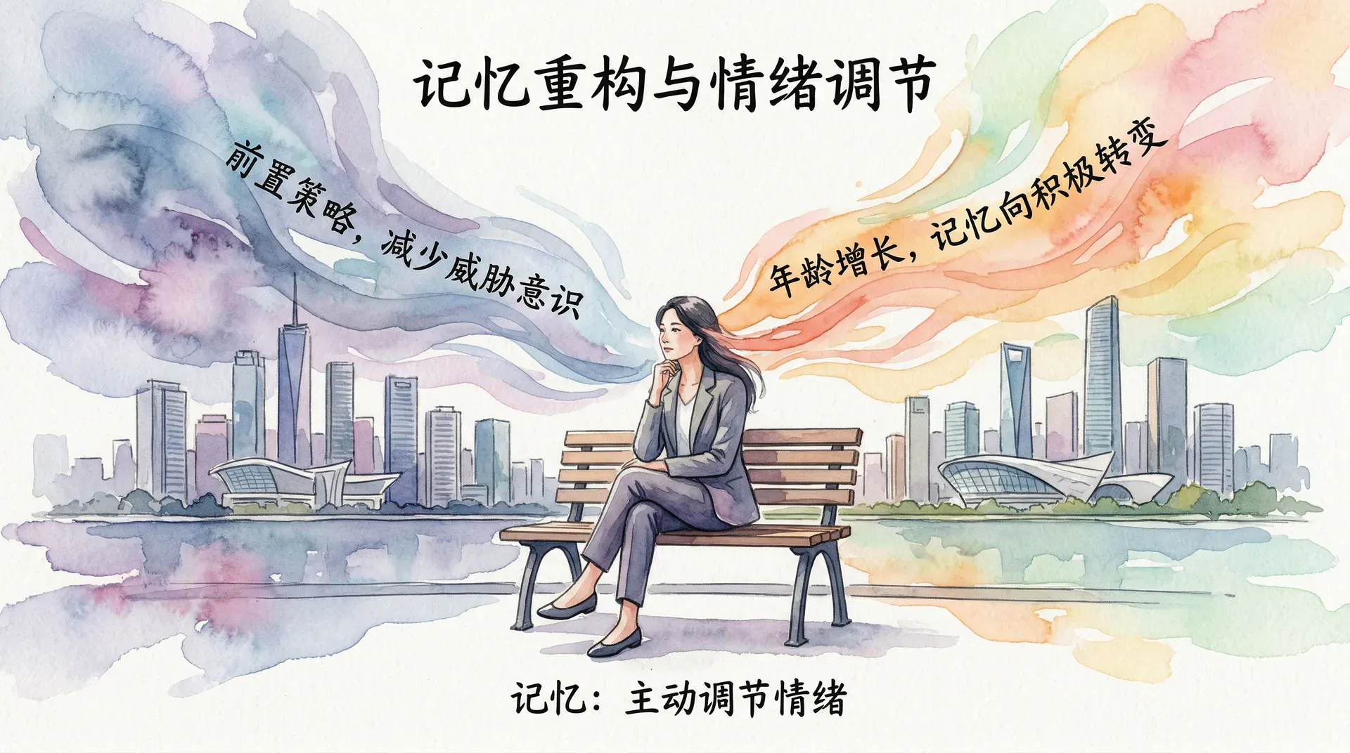 记忆不仅是对过去的被动存储,更是影响当前情绪状态、想法和行为的主动工具。前置式情绪调节策略可以防止或减少威胁幸福感的事件和想法进入意识。随年龄向积极信息的效价转变,已在生活事件和实验室刺激的记忆研究中得到广泛证实。