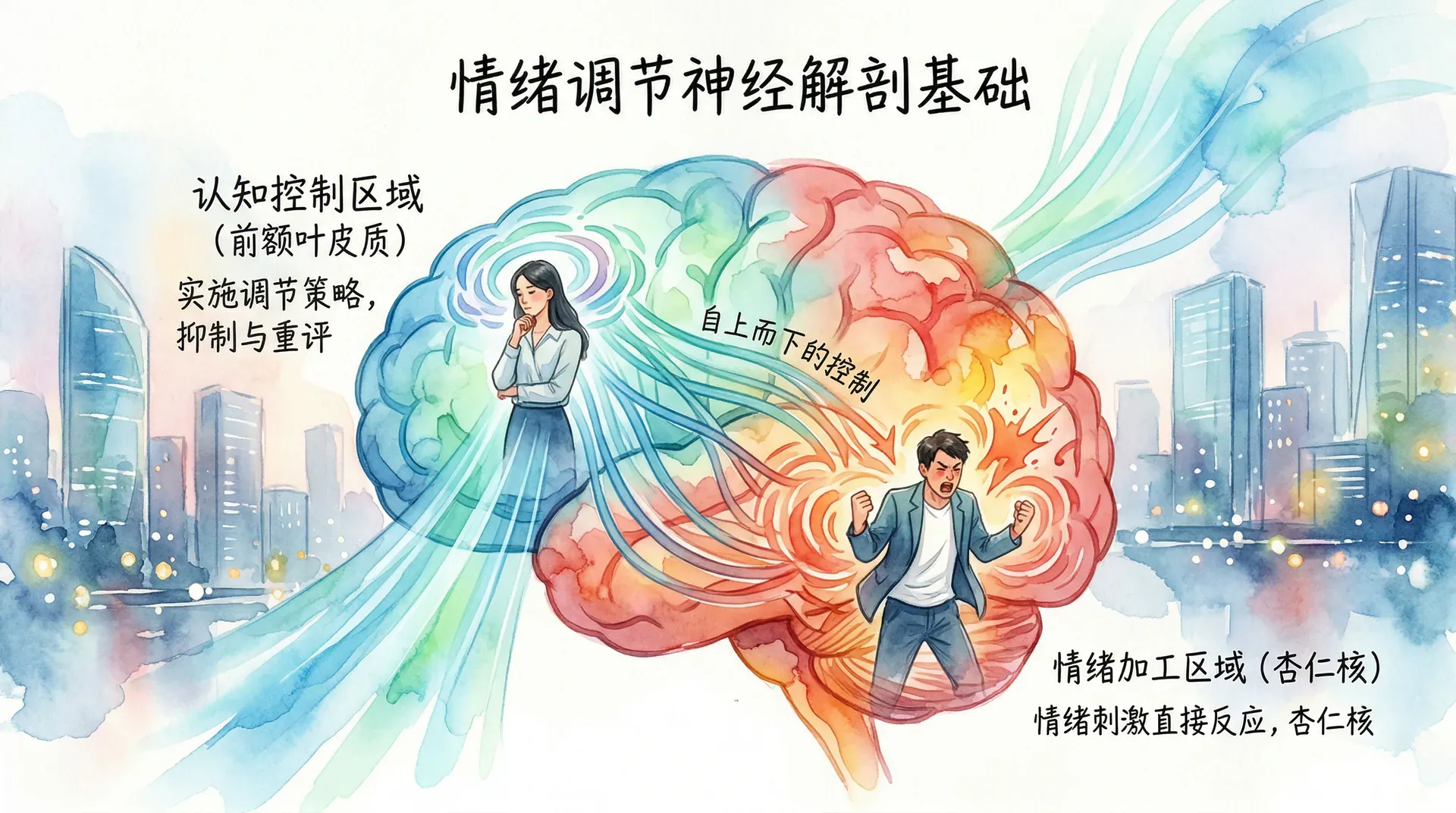 与情绪调节相关的脑区域可以分为两个功能集群:一是实施调节策略的区域,二是被调节的情绪处理区域。前者主要包括前额叶皮质的背外侧和腹外侧部分,这些区域参与主动的认知控制与抑制功能,是认知重评策略生成和维持的神经基础;后者则涵盖杏仁核、脑岛和纹状体等结构,负责对情绪刺激的直接加工与反应。在情绪调节过程中,前额叶皮质通过自上而下的控制信号,调节这些情绪脑区的活动水平,从而实现对情绪体验和表达的有意识调控。