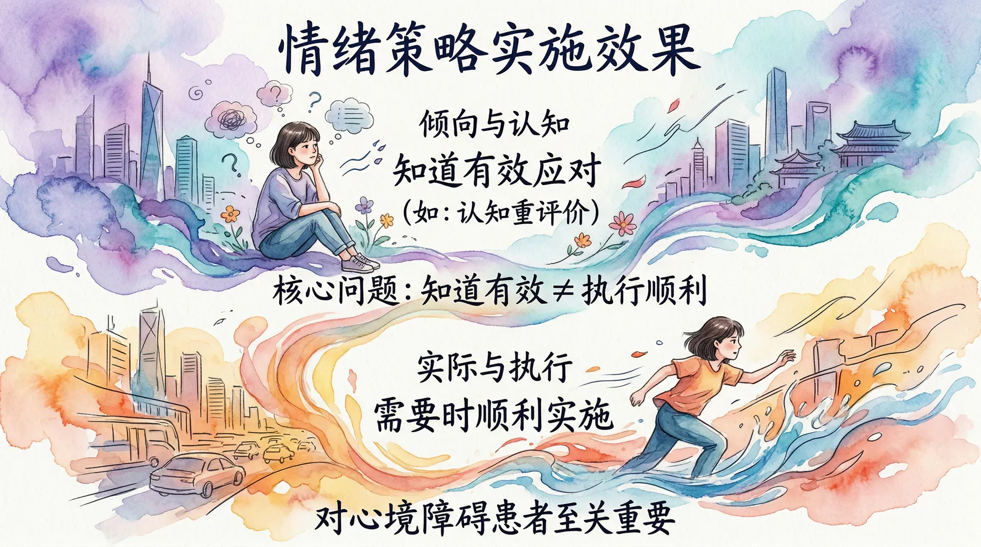 了解人们倾向于使用哪些情绪调节策略固然重要,但另一个同样关键的问题是:心境障碍患者在实际使用这些策略时,效果如何?即便某人知道认知重评价是有效的应对方式,他们是否真的能够在需要时顺利实施?这一问题对于理解情绪调节困难的本质至关重要,也直接影响临床干预方案的设计。