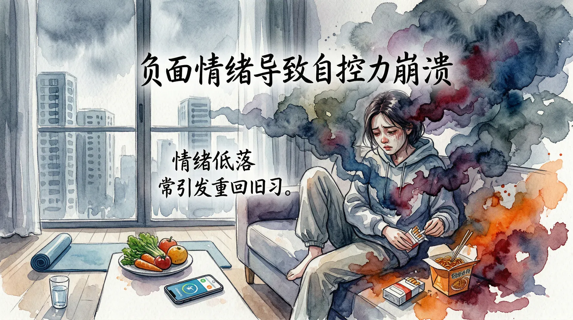 这类错误的情绪修复策略会形成一个闭环:负面情绪引发失控行为,失控行为带来短暂安慰,但随后意识到自己未能坚守目标,又会产生更深的负面情绪,反过来威胁未来的自我调节能力。