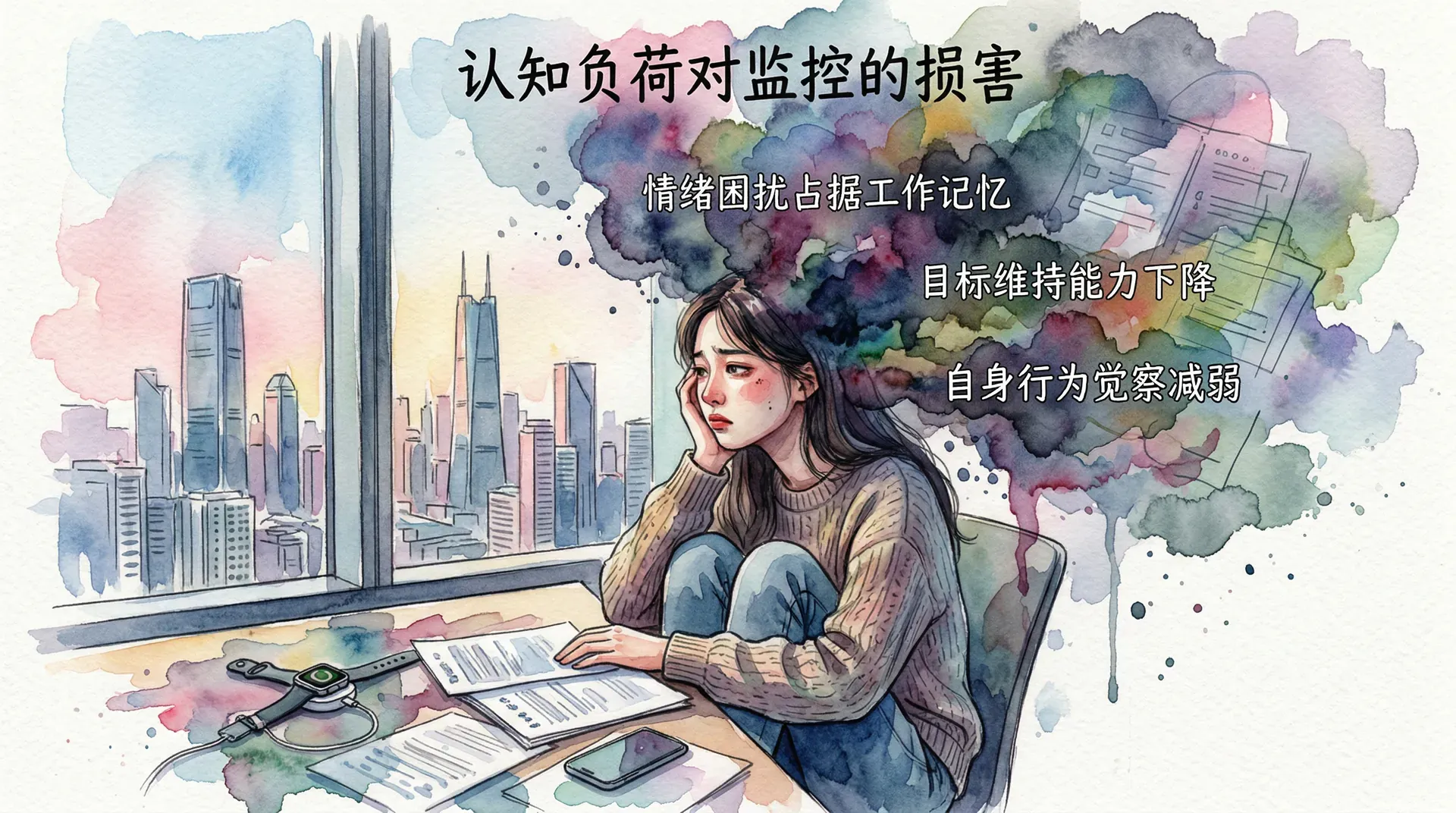 负面情绪还会通过增加认知负荷来干扰自我调节中的监控功能。当工作记忆被情绪困扰占据时,维持目标和行为标准的能力就会下降,对自身行为的觉察也随之减弱。