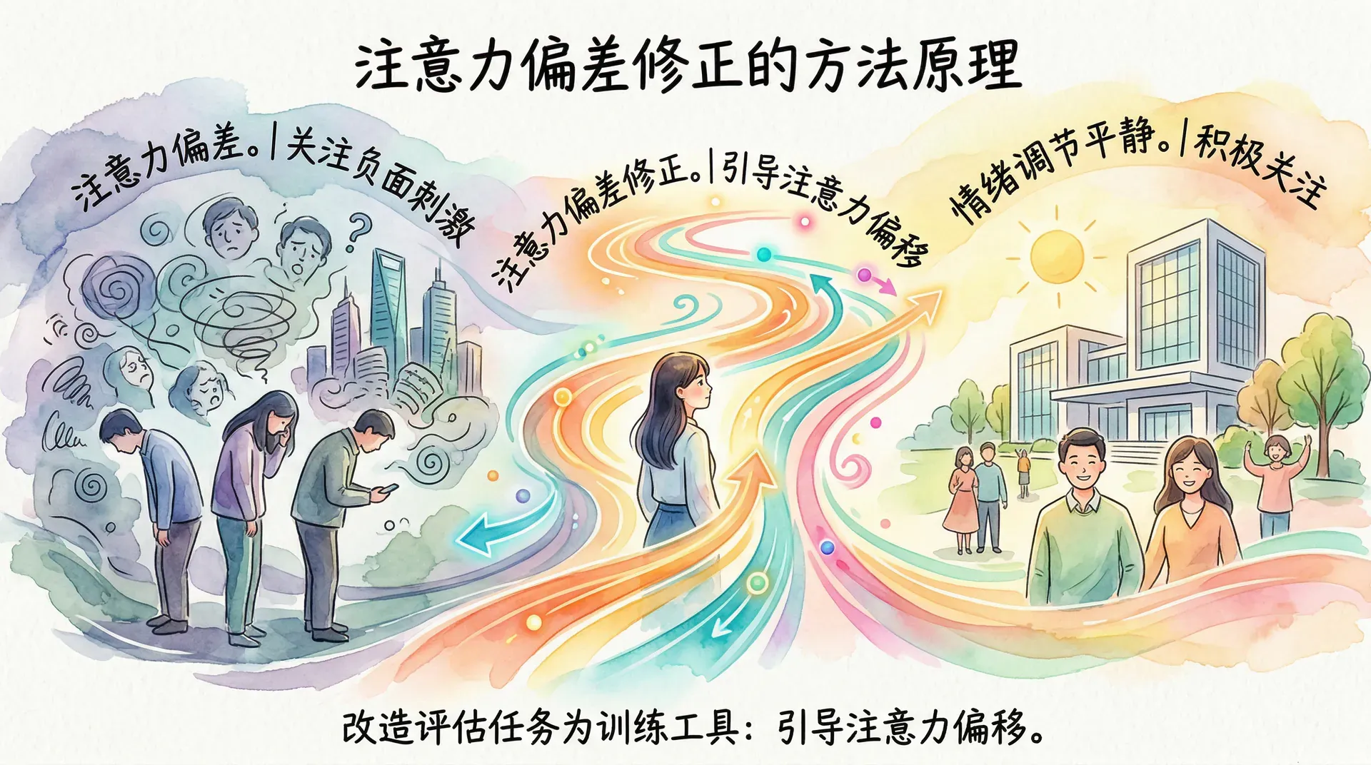 从评估注意力偏差与情绪调节关联的基础研究,到系统验证注意力偏差修正因果效果的实验研究,再到探索其在现实场景中临床价值的应用研究,这一领域在相对较短的时间内积累了相当丰富的证据。总体而言,这些证据有力地支持了以下核心论点:对负面信息有偏差的注意力反应,在因果意义上有助于情绪调节,影响个体对压力的情绪响应性,并在情绪功能障碍的形成和维持中发挥实质性作用。