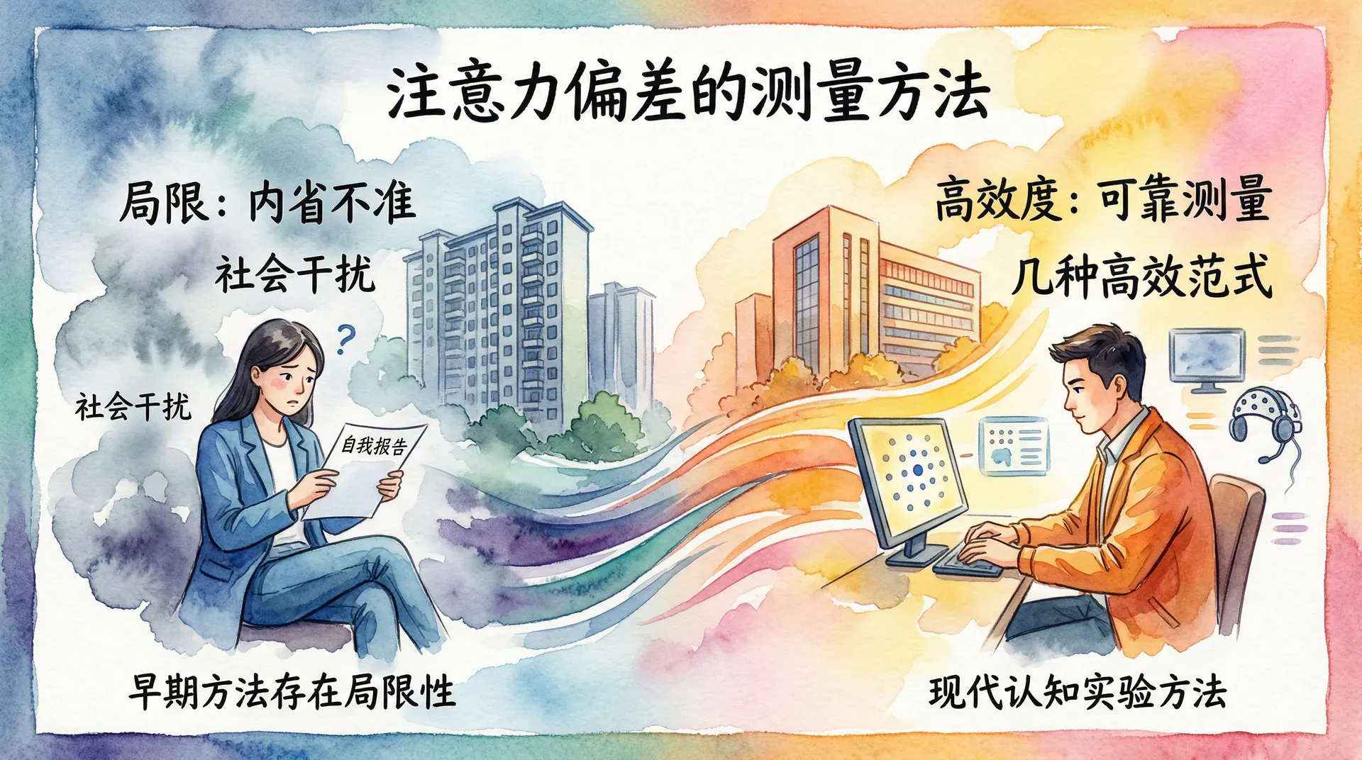 在确认注意力偏差与情绪调节的关联之前,研究者首先需要建立可靠的测量工具。早期研究依赖自我报告的方式来评估个体对不同信息的注意倾向,但这种方法存在明显局限性——人们对自身注意过程的内省往往不够准确,且容易受到社会期望效应的干扰。为此,研究者转向认知实验方法,开发出了几种具有较高效度的测量范式。