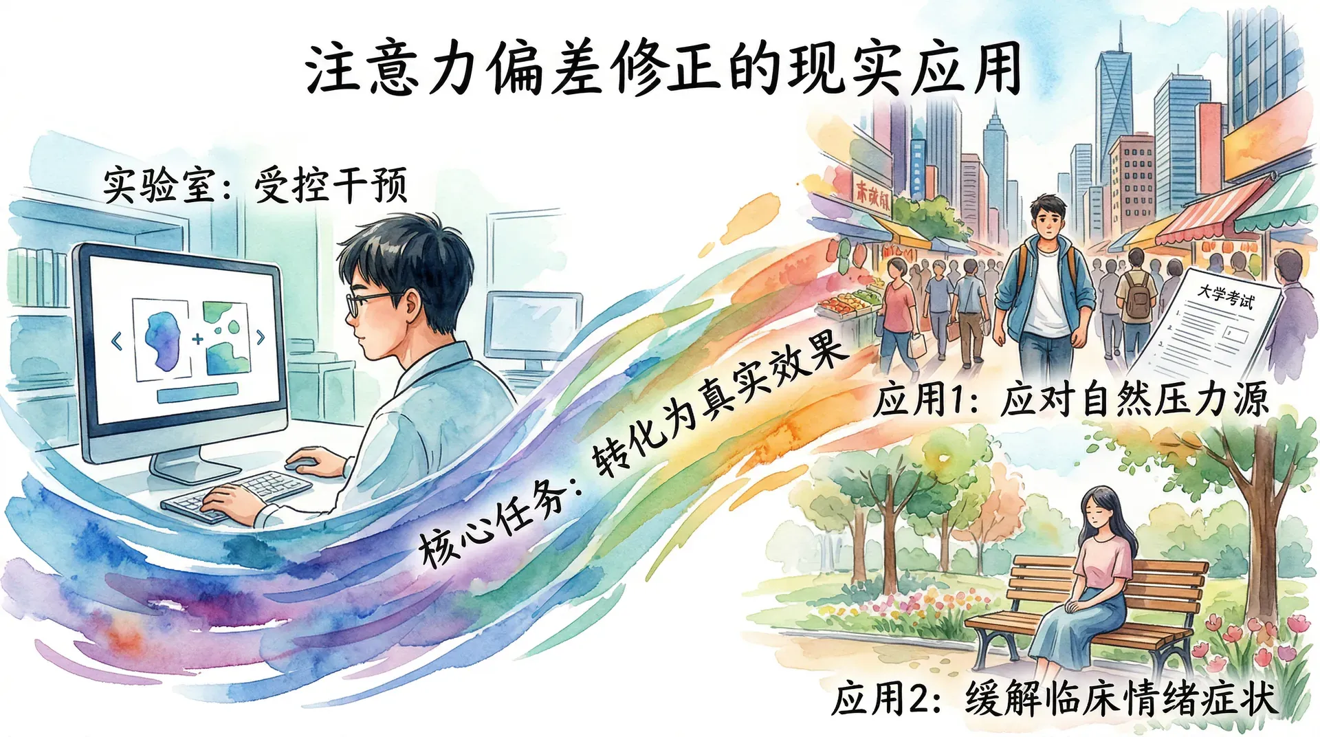 实验室研究提供了因果证据,但实验室环境与现实生活之间存在相当大的差距。在受控条件下有效的干预,在真实世界中未必能够产生同等效果。因此,研究者进一步检验了注意力偏差修正程序在现实情境中的应用价值,包括对自然压力源的应对,以及对临床情绪症状的缓解。