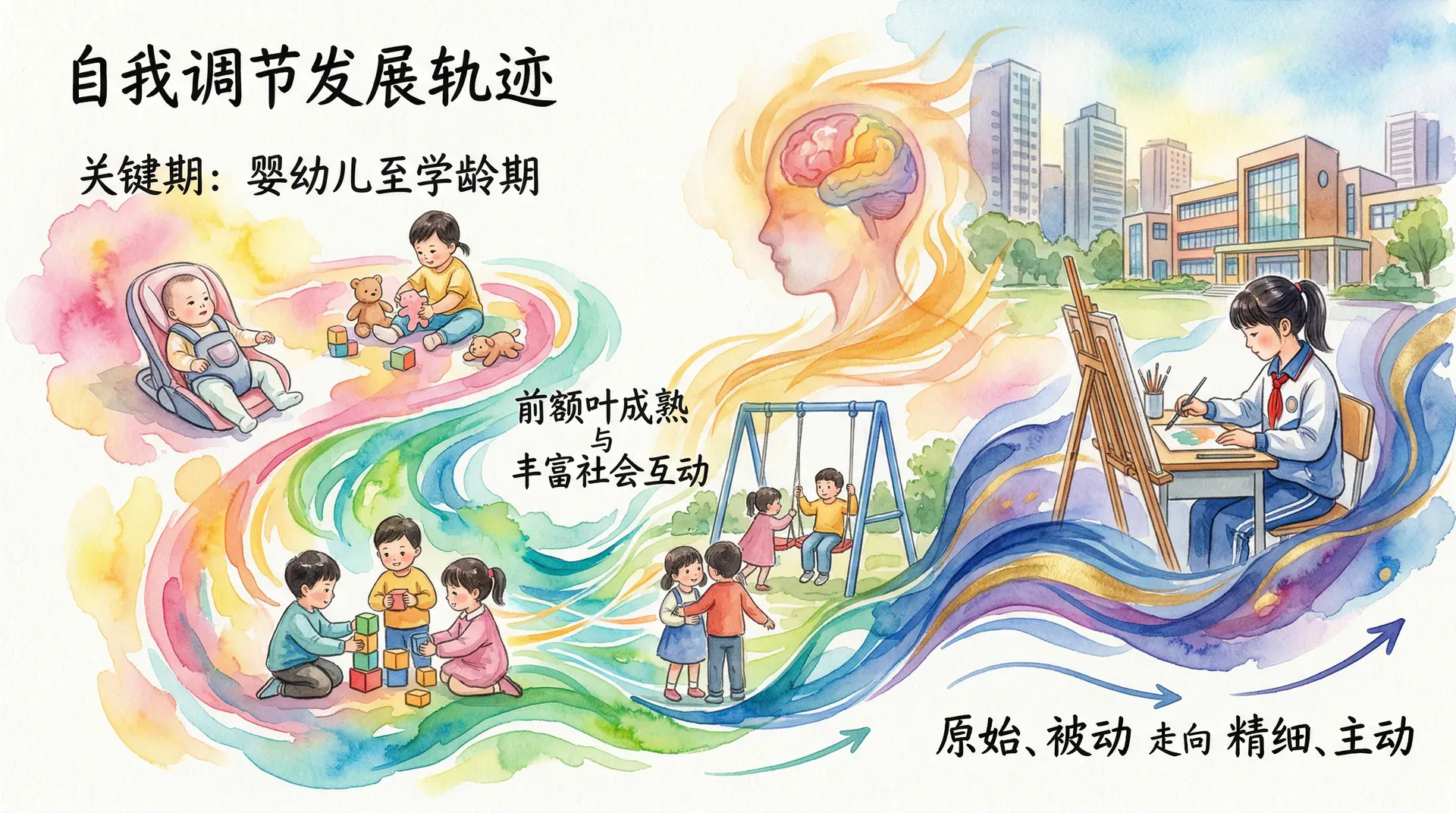 自我调节能力的发展贯穿人的整个生命历程,但最为关键的奠基阶段集中在婴幼儿期至学龄期。这一时期,大脑前额叶皮层的持续成熟与日益丰富的社会互动经验相互促进,共同推动着调节能力从原始、被动走向精细、主动。