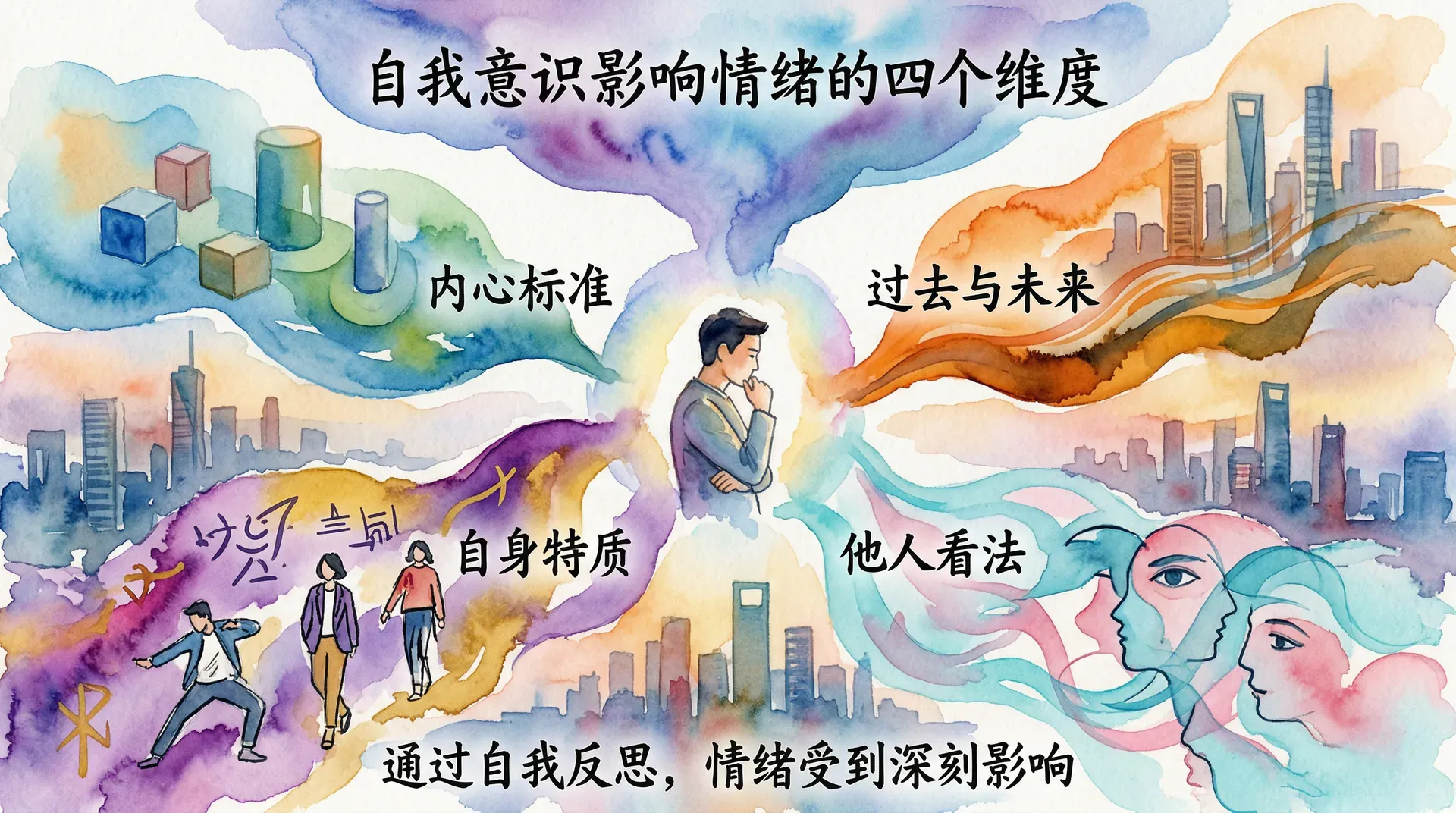 人类能够有意识地反思自己,这使得情绪受到四个层面的深刻影响:与内心标准的比对、对过去与未来的思索、对自身特质的评价,以及对他人看法的揣摩。每一种机制都依赖于自我反思的能力,也都在情绪的产生与调节中扮演着不可或缺的角色。