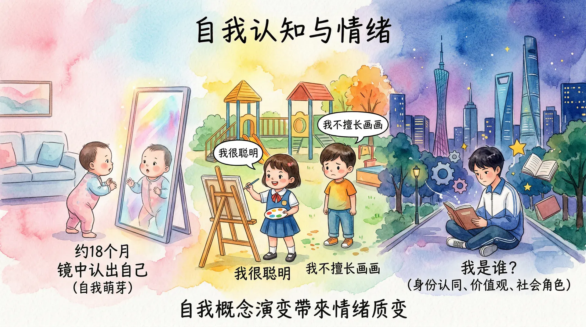 人类在生命早期便开始形成对自身的认知,并随着发展逐渐以更复杂、更抽象的方式理解自己。这一自我概念的形成过程,也是情绪生活日益丰富的过程,随着儿童开始思考自己的特质和行为,各种与自我相关的情绪便接踵而至。婴儿在约18个月大时开始通过镜子认出自己,这是自我概念萌芽的重要里程碑;到了幼儿期,孩子开始用“我很聪明”或“我不擅长画画”这样的话描述自己;进入青春期后,自我认知变得更加复杂,开始涉及价值观、身份认同和社会角色等抽象层面。每一个发展阶段,自我概念的演变都带来了情绪体验的质变。