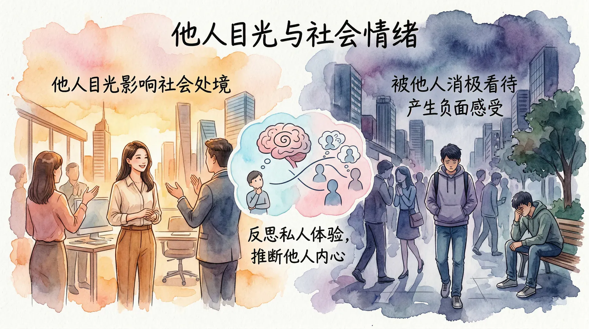 大量人类情绪根植于对他人看法的揣摩。他人的评价在现实层面确实影响着个体的社会处境,职业发展、人际关系、社会地位莫不如此。因此,人们对被他人积极还是消极看待会产生截然不同的感受,这本是一种自然的适应性反应。自我意识本身也需要推断他人的内心,有研究者甚至提出,反思私人体验的能力,最初正是为了帮助人们更准确地推断他人对自己的想法而进化出来的。