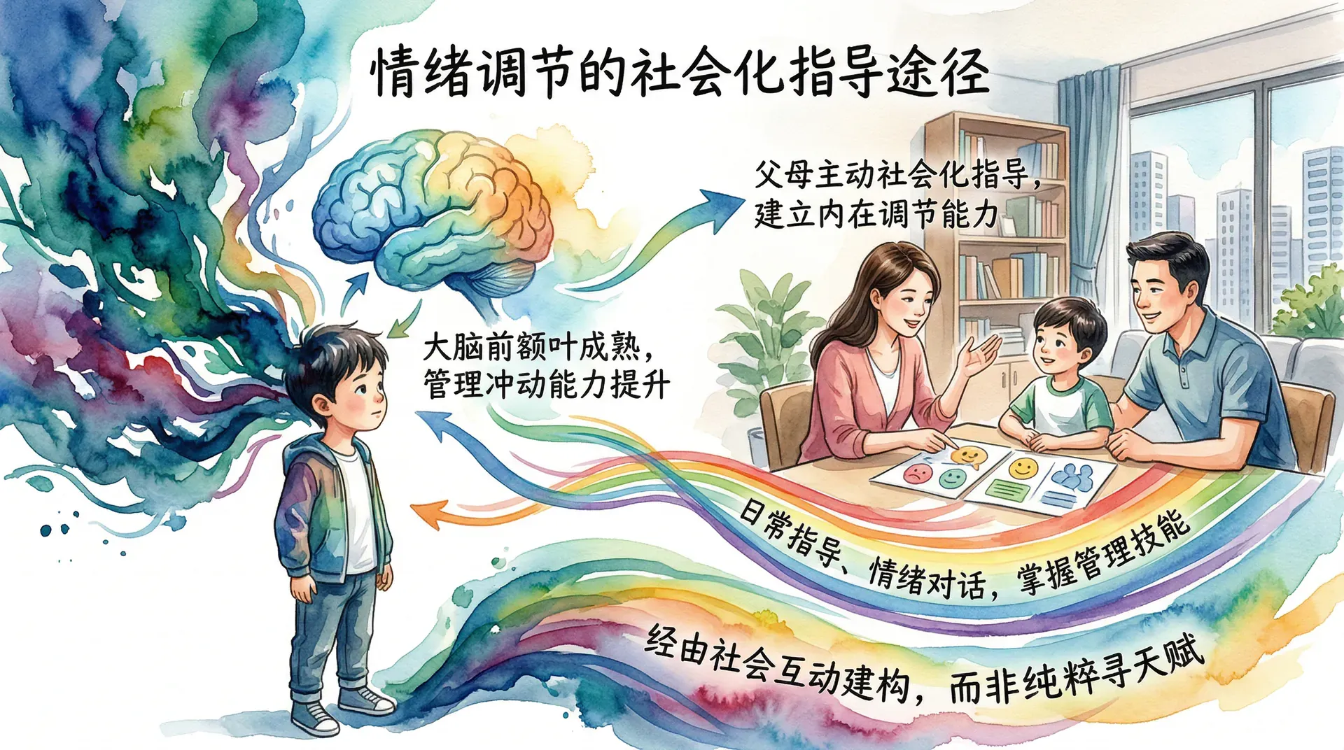 随着前额叶大脑区域逐渐成熟,儿童管理自身感受、冲动和行为的能力稳步提升。父母在这一过程中的作用不仅是管理孩子当下的情绪,更是通过系统性的社会化指导,帮助儿童建立理解和运用情绪调节策略的内在能力。这种社会化指导通常是主动且有意识的,父母通过日常指导、情绪对话和家庭互动模式,引导儿童学会评估自身感受、掌握管理情绪的具体技能,并逐步理解情绪自控的文化期望。由于这些社会化过程贯穿整个成长历程,个人进入成年期后所具备的情绪自我调节能力,在很大程度上是经由社会互动建构而成的,而非纯粹出于个体天赋。