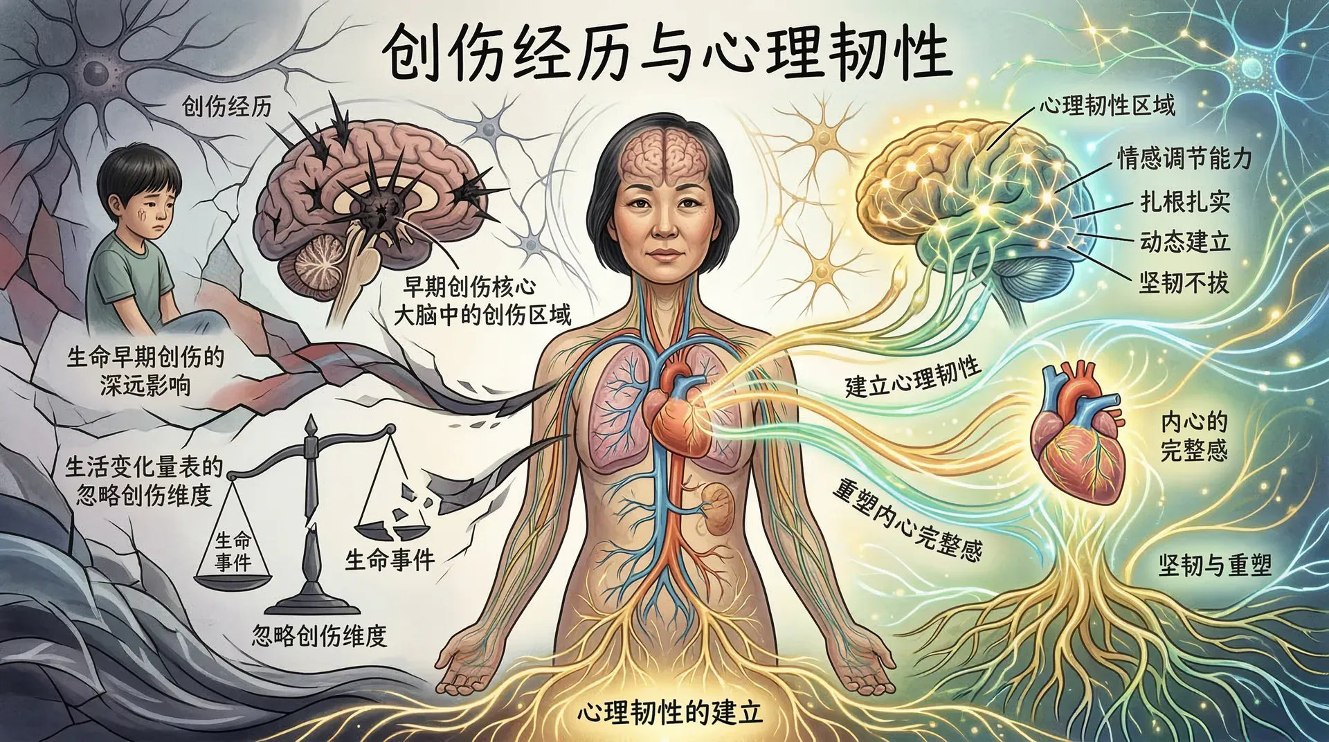 如果在生命早期经历了严重的创伤,如家庭暴力、重大丧失或自然灾害,这些经历会以各种方式渗透进此后的生活,影响我们对压力的感知方式和应对能力。早期干预和心理支持,对于修复这种内在损伤至关重要。
