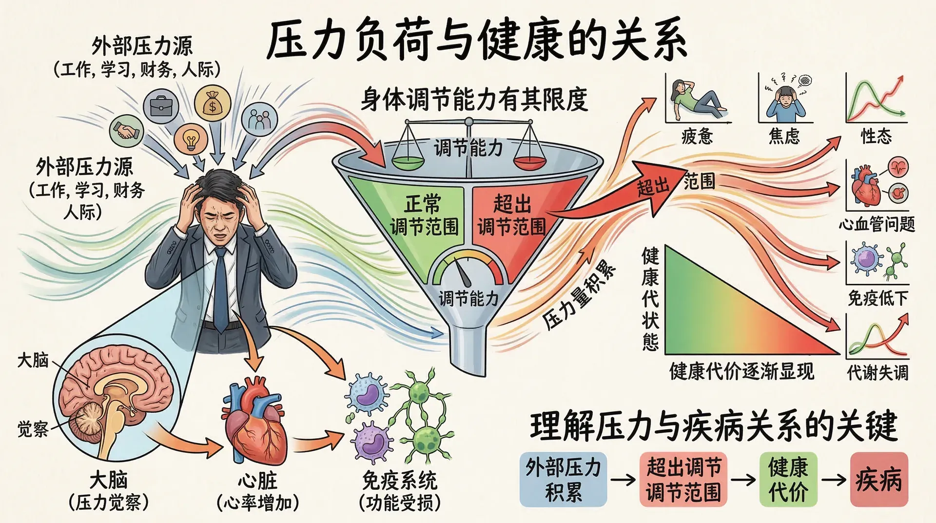 身体的调节能力并非无限,当外部压力持续积累、超出调节范围时,健康代价就会逐渐显现。理解这一点,是理解压力与疾病之间关系的关键。