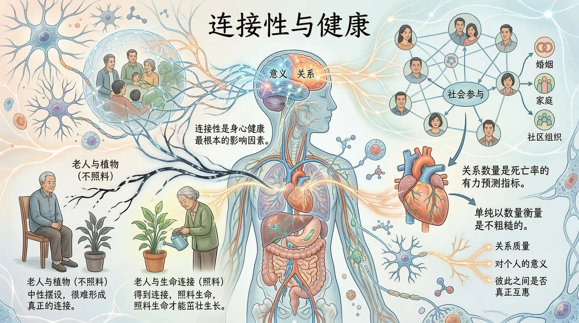 连接性是指个体与他人、与环境以及与自身之间的有机联结程度。这种联结通过多个层面影响身心健康。