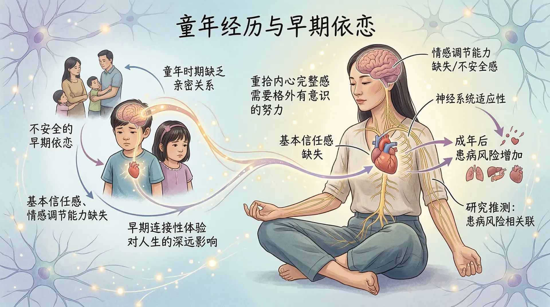 童年时期与父母缺乏亲密关系,往往与成年后更高的患病风险相关联。研究者推测,这与早期连接性体验对整个人生发展轨迹的深远影响有关。正是在童年阶段,基本的人类信任感、归属需求、以及情感调节能力才得以逐步建立。如果这些体验因各种原因而缺失,成年后若想重拾内心的完整感,往往需要付出格外有意识的努力。