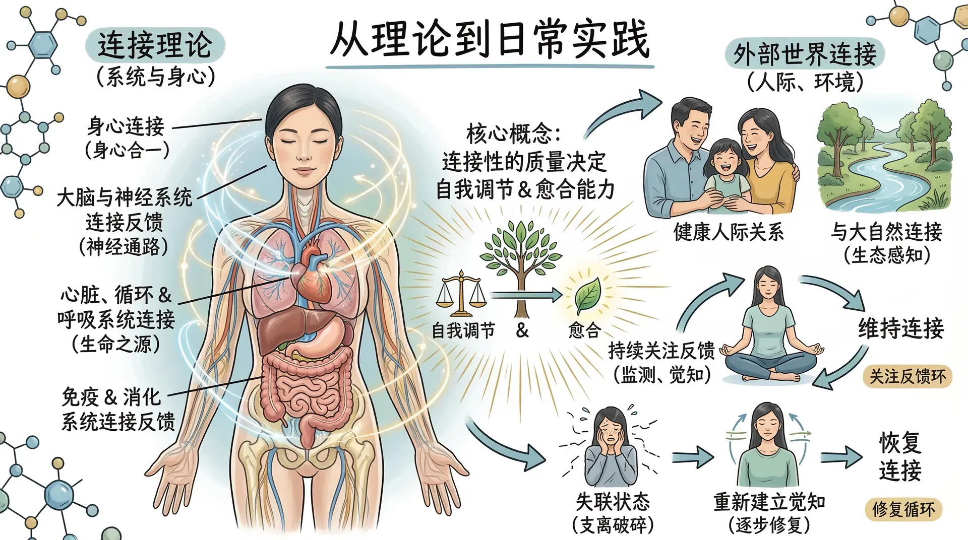 理解连接性与健康的关系,并不需要深入钻研所有反馈循环的生理细节。简而言之,我们内部各系统之间,以及我们与外部世界之间连接的质量,决定了我们自我调节和愈合的能力。而这种连接的质量,可以通过持续地关注相关反馈来维持,也可以在失联之后通过重新建立觉知来逐步恢复。