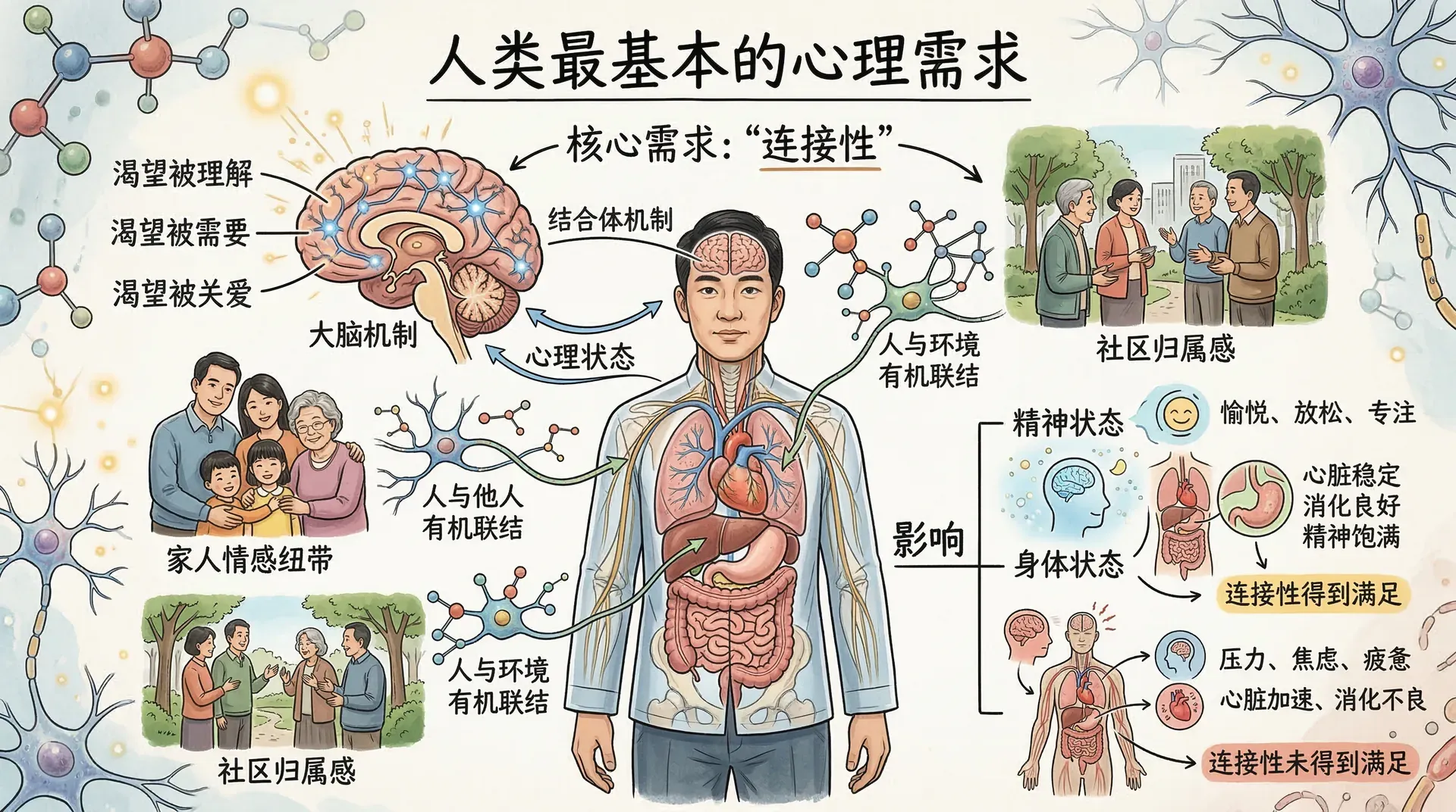 每个人都渴望被理解、被需要、被关爱。这种渴望并非软弱,而是人类与生俱来的心理底色。心理学将这种渴望背后的核心需求称为“连接性”,它指的是人与他人、与环境、与自身之间的有机联结。无论是家人之间的情感纽带,还是一个人对所在社区的归属感,这些连接都在悄无声息地影响着我们的身体与精神状态。
