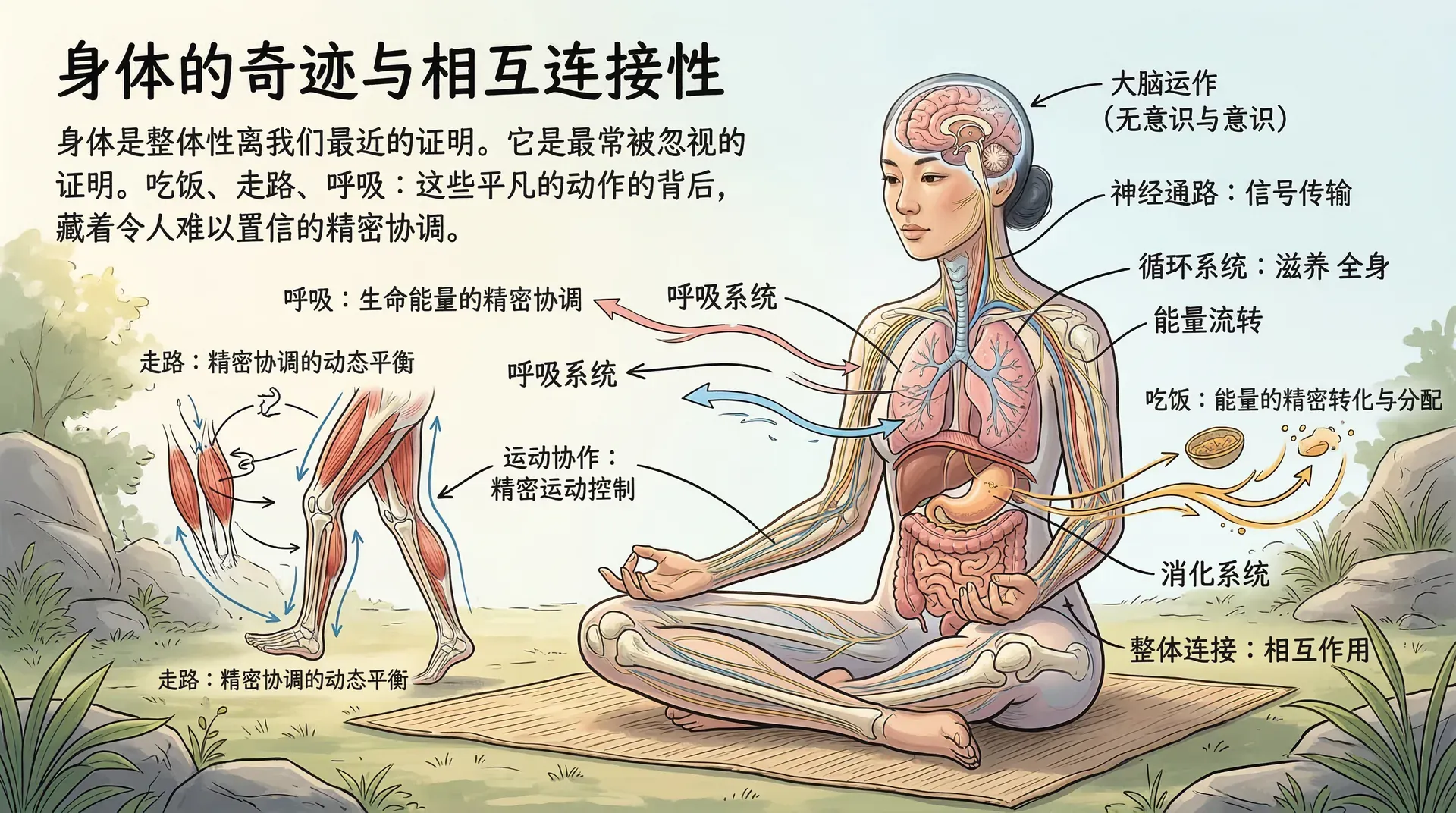 身体是整体性离我们最近的证明,却也是最常被我们忽视的证明。我们每天都活在自己的身体里,对它的运作方式却几乎一无所知,甚至漠然置之。正是因为太过熟悉,吃饭、走路、呼吸这些事才会彻底从意识里消失。但只要稍加留意,就会发现这些“平凡”动作的背后,藏着令人难以置信的精密协调。