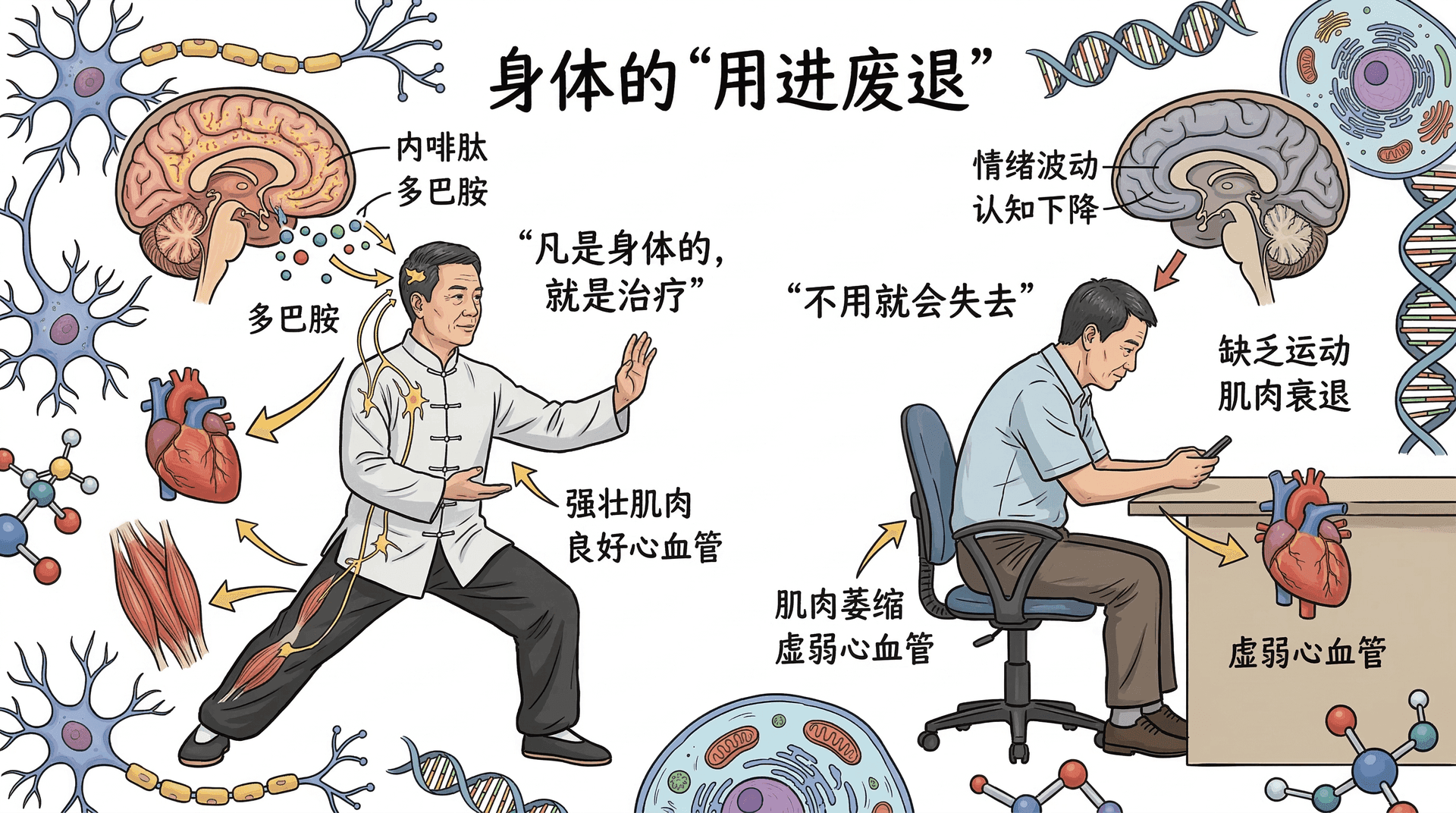 中医经典中有一句话:“流水不腐,户枢不蠹。”一条长期不流动的河会变成死水,一扇长期不开的门轴会生锈。人体也遵循同样的道理,需要适度的活动才能维持健康。