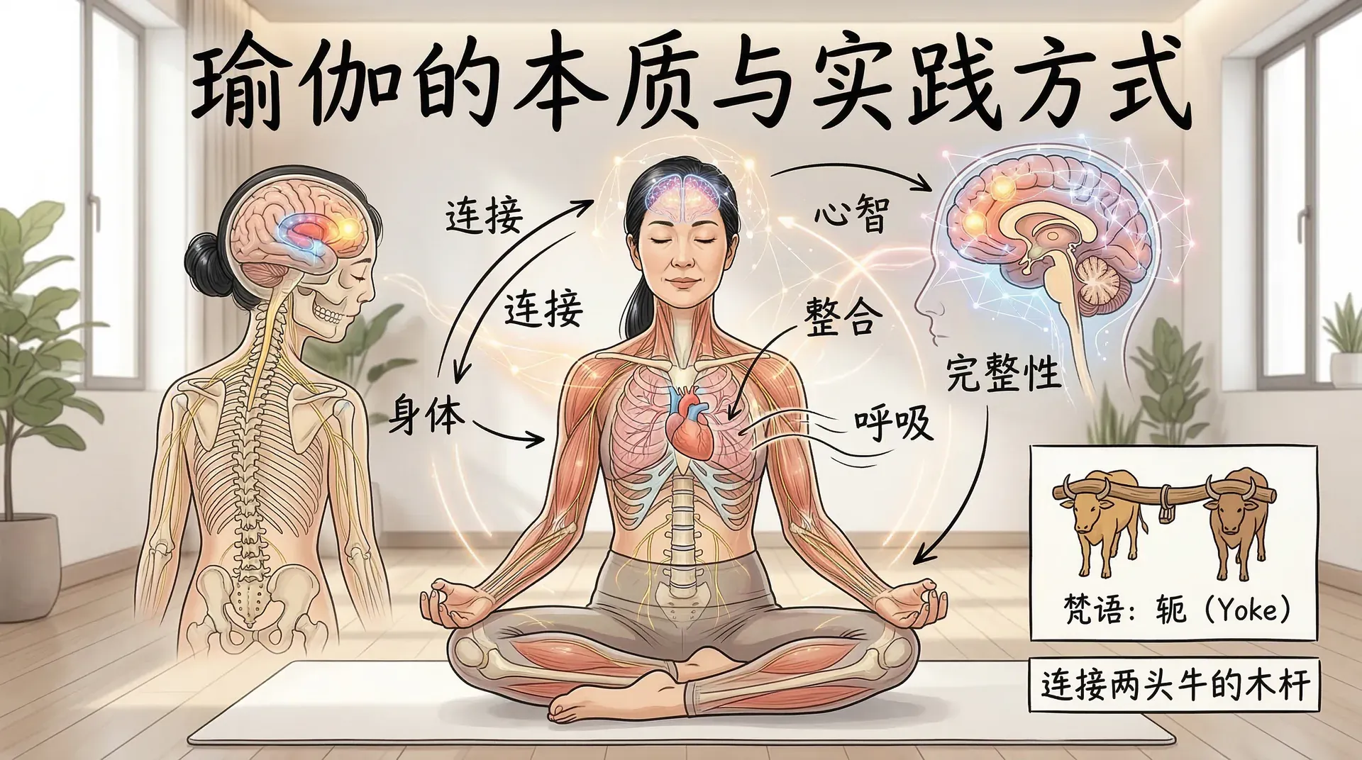 瑜伽在梵语中,字面意思是“轭”——连接两头牛的那根木杆。瑜伽的练习,就是将身体与心智连接、统一的练习,深入体验它们本来就未曾分离的状态。这个词的基本主旨始终如一:通过有纪律的练习实现连接、整合,实现完整性。