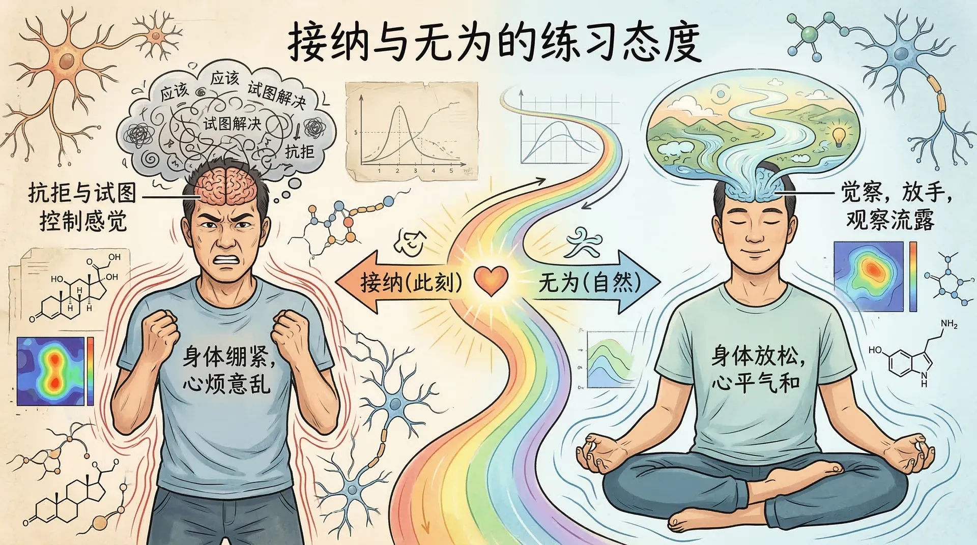 “无为”态度是指不试图达到任何特定目标或状态,而是简单地觉察当下的体验。这种态度的重要性在于:它避免了因期待而产生的挫折感,让练习者能够真正接纳当下的体验,从而获得更深层的觉察和转化。
