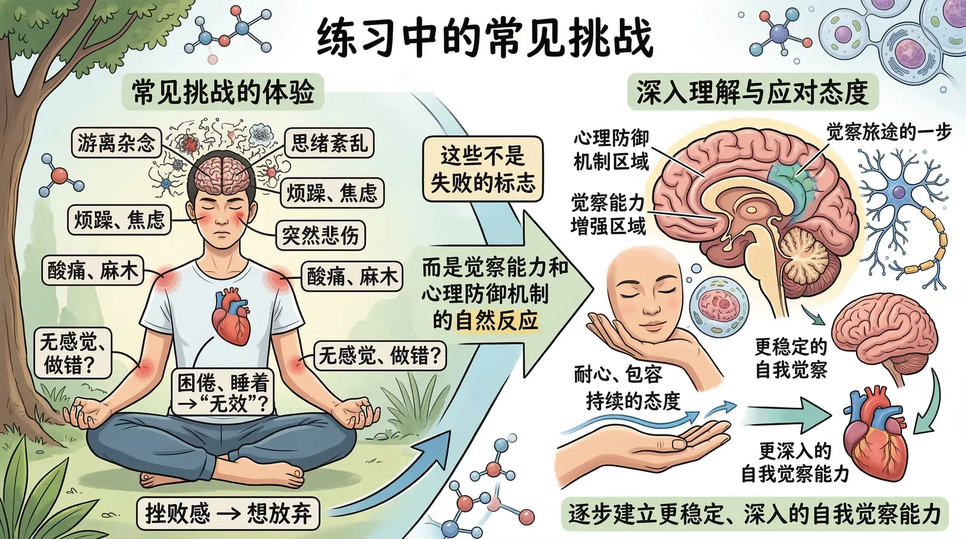 实际上,这些现象并不是失败的标志,而是自身觉察能力和心理防御机制的自然反应。只有理解这些常见挑战产生的原因,明白它们只是练习旅途中的一部分,我们才能以更加耐心、包容、持续的态度面对练习中的各种波动,逐步建立起更稳定、深入的自我觉察能力。
