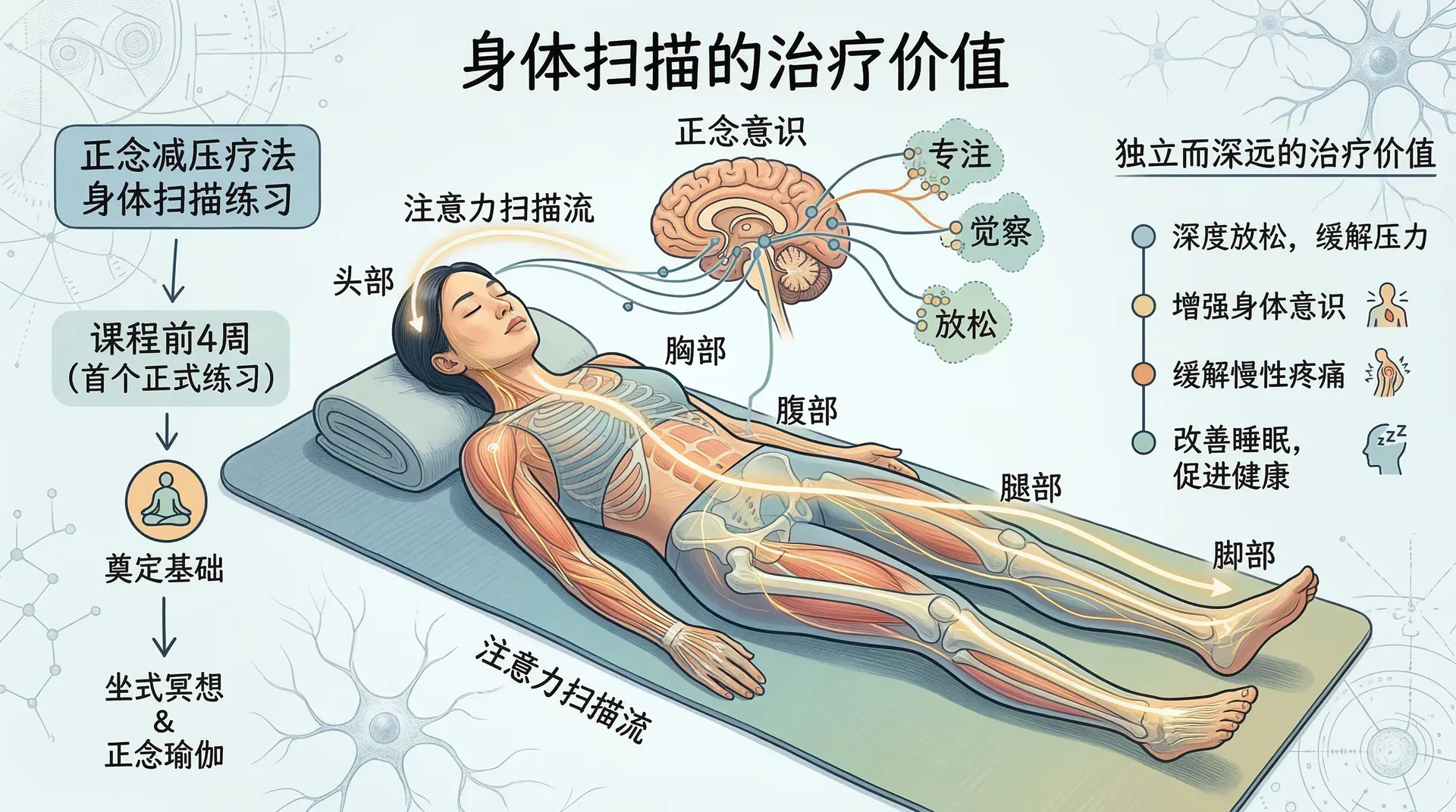 在正念减压疗法中,身体扫描通常是参与者接触的第一个正式练习,贯穿课程的前四周。它不仅为后续的坐式冥想和正念瑜伽奠定基础,本身也具有独立而深远的治疗价值。