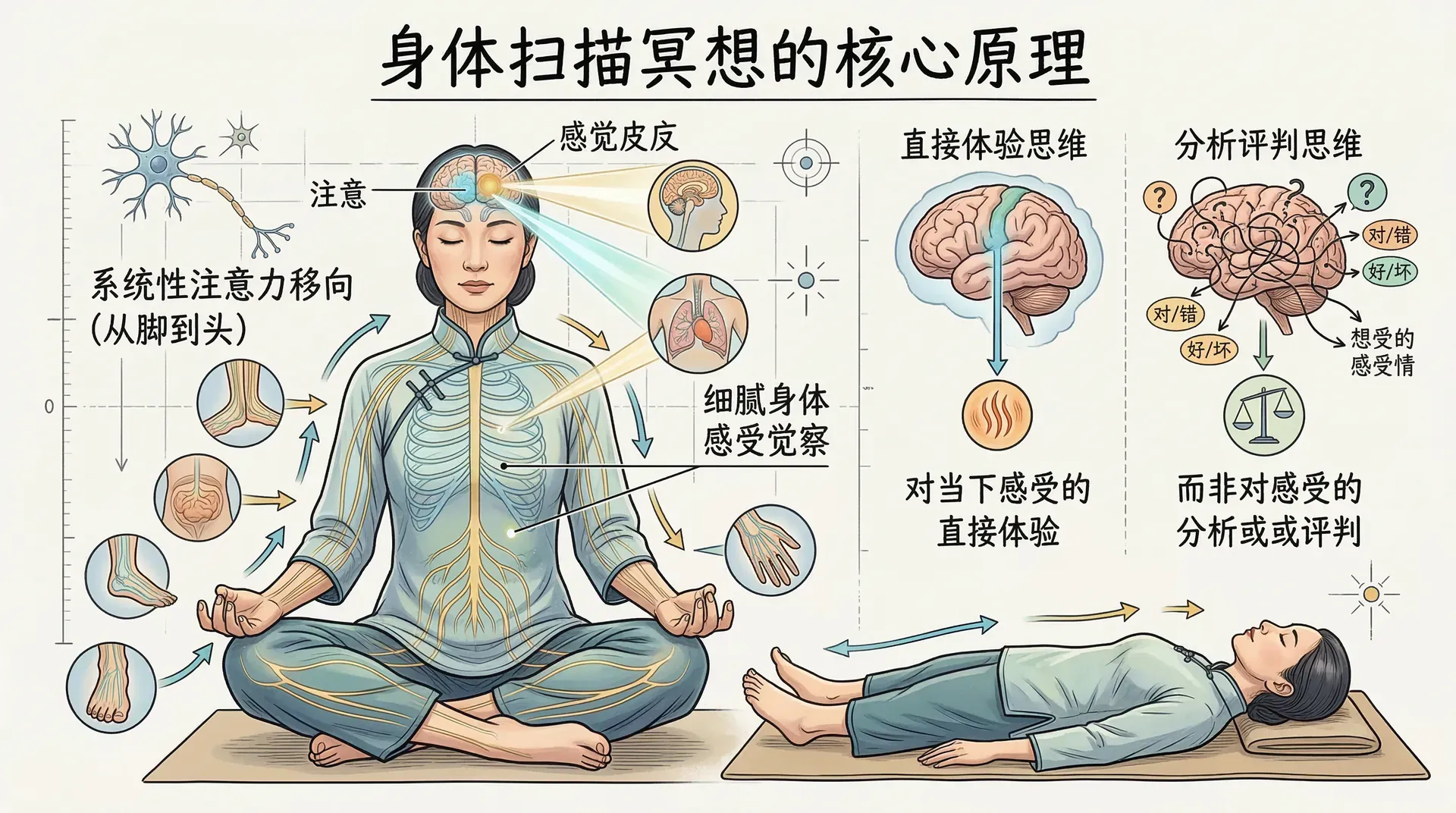 身体扫描冥想通过以下方式帮助处理身心创伤: