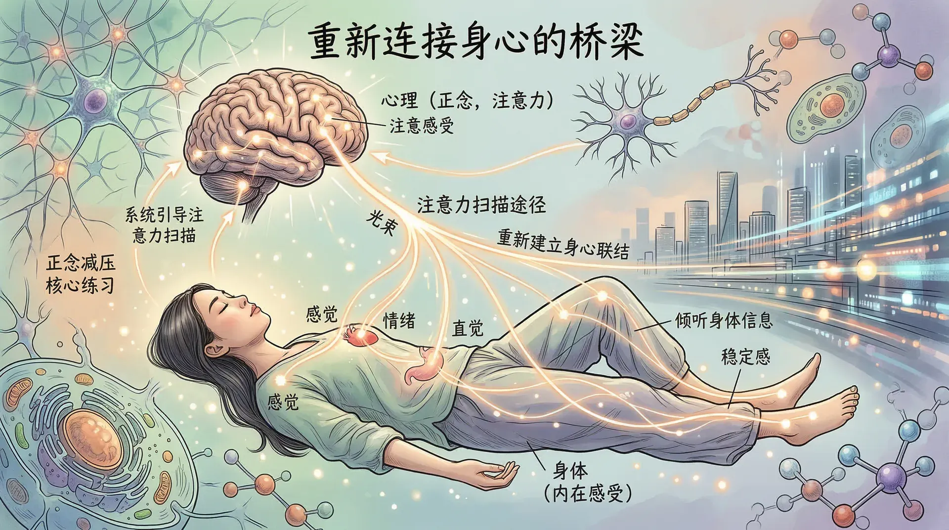 以张女士的经历为例,她通过身体扫描发现颈部的“堵塞感”与童年创伤有关,这次觉察帮助她理解了多年身体症状的深层来源,并由此开始了真正的康复历程。
