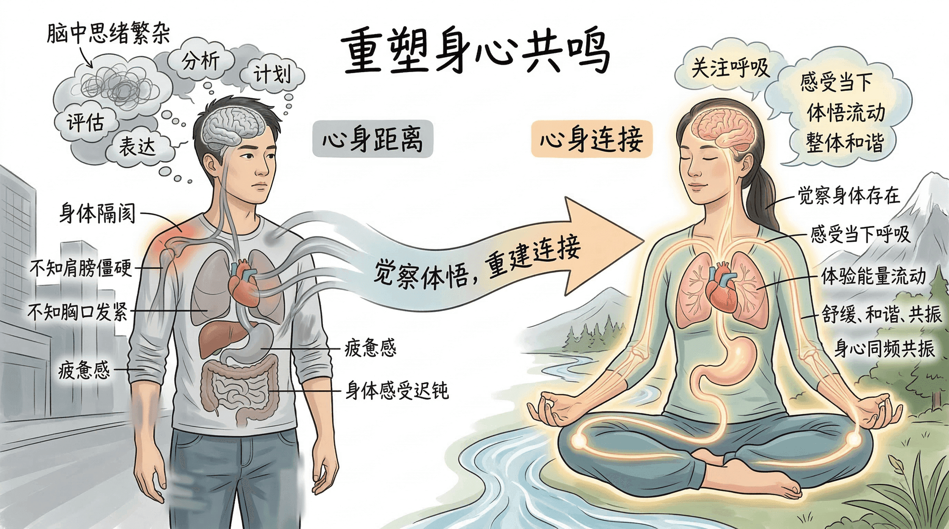 正念练习通过培养对身体感受的觉察能力,帮助我们重新建立与身体之间的连接。