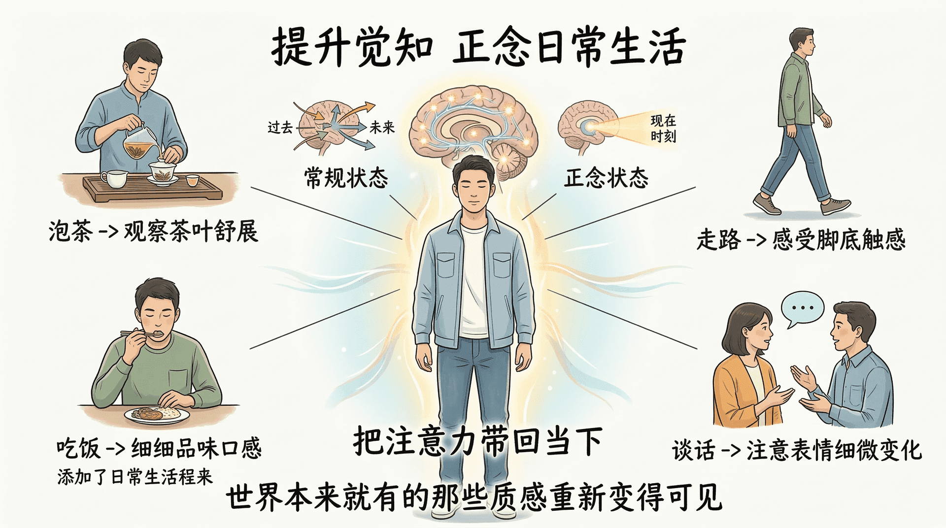 正式的冥想练习是一个基础,但正念真正发挥作用的地方,是日常生活中的每一个普通时刻。