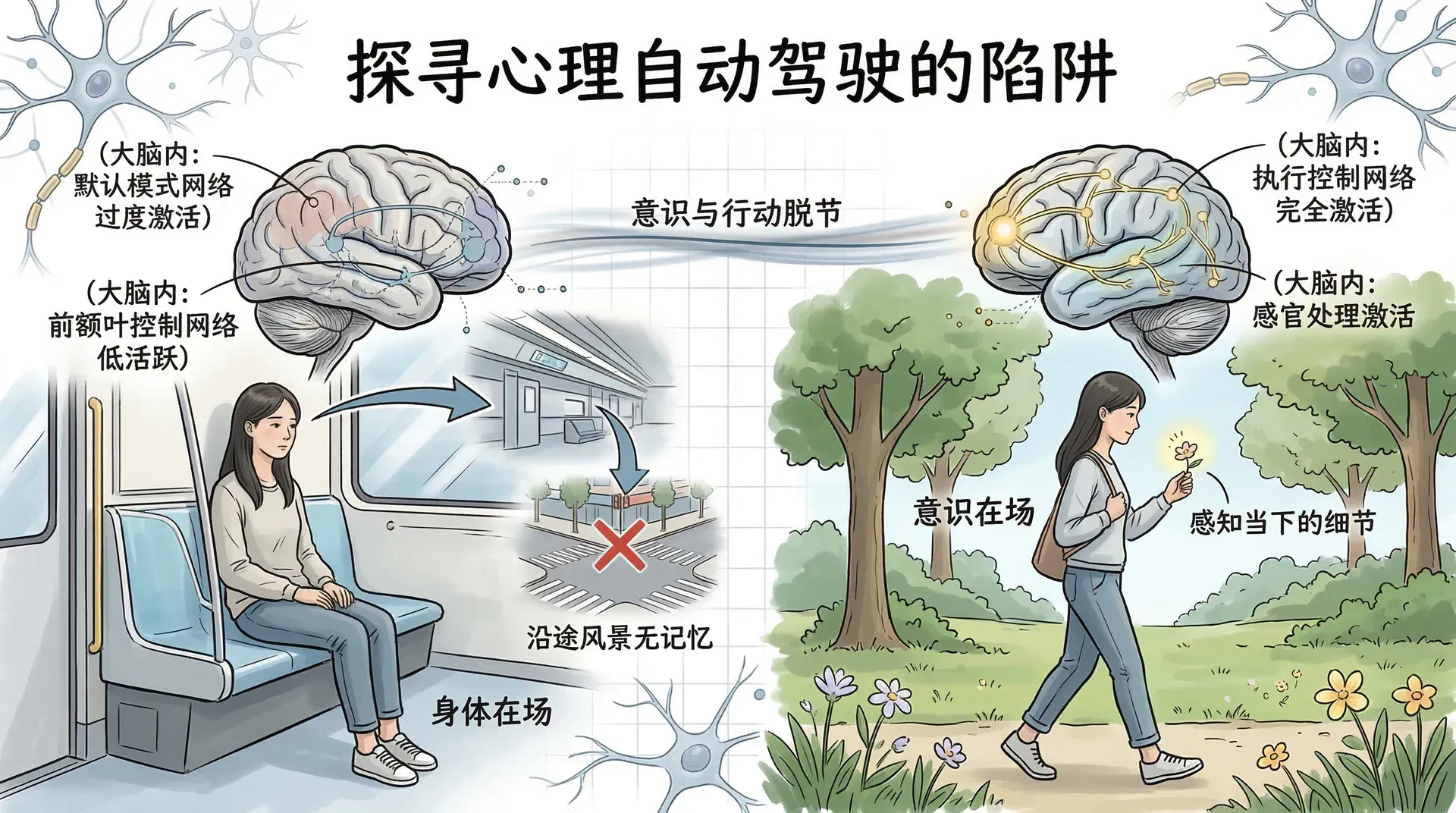 在日常生活中,我们的大脑经常处于一种“自动驾驶”的模式。就像早上上班,从家门口出发,等回过神来已经坐在了地铁上,沿途的路口、店铺完全没有留下任何印象。这不只发生在通勤路上,我们的整个心理状态其实大多数时候都是如此——身体在场,意识却不知道飘去了哪里。