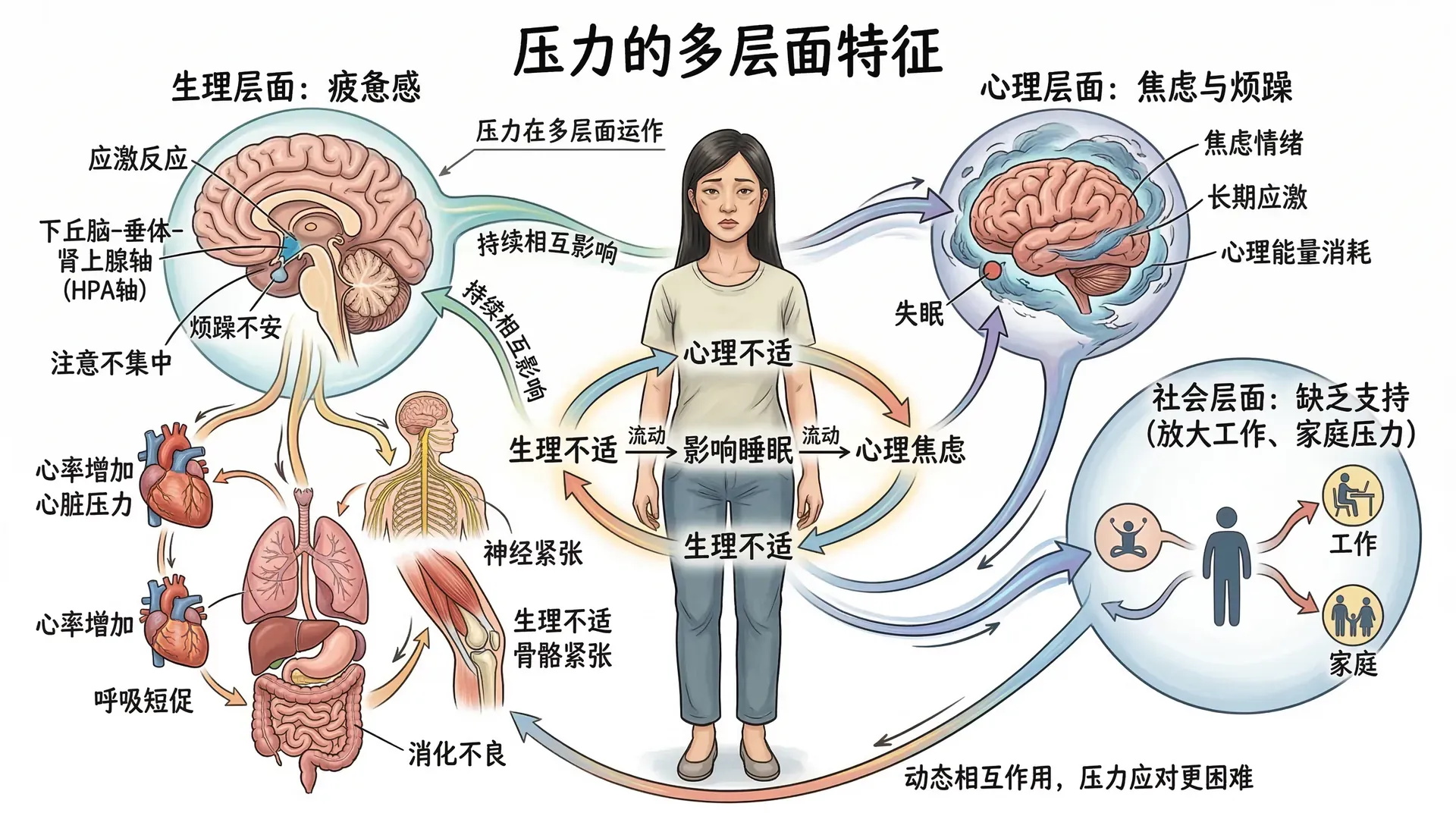 压力不只是一种主观感受,它同时在生理、心理和社会三个层面发生作用,这三个层面相互影响,共同构成了个体真实的压力体验。