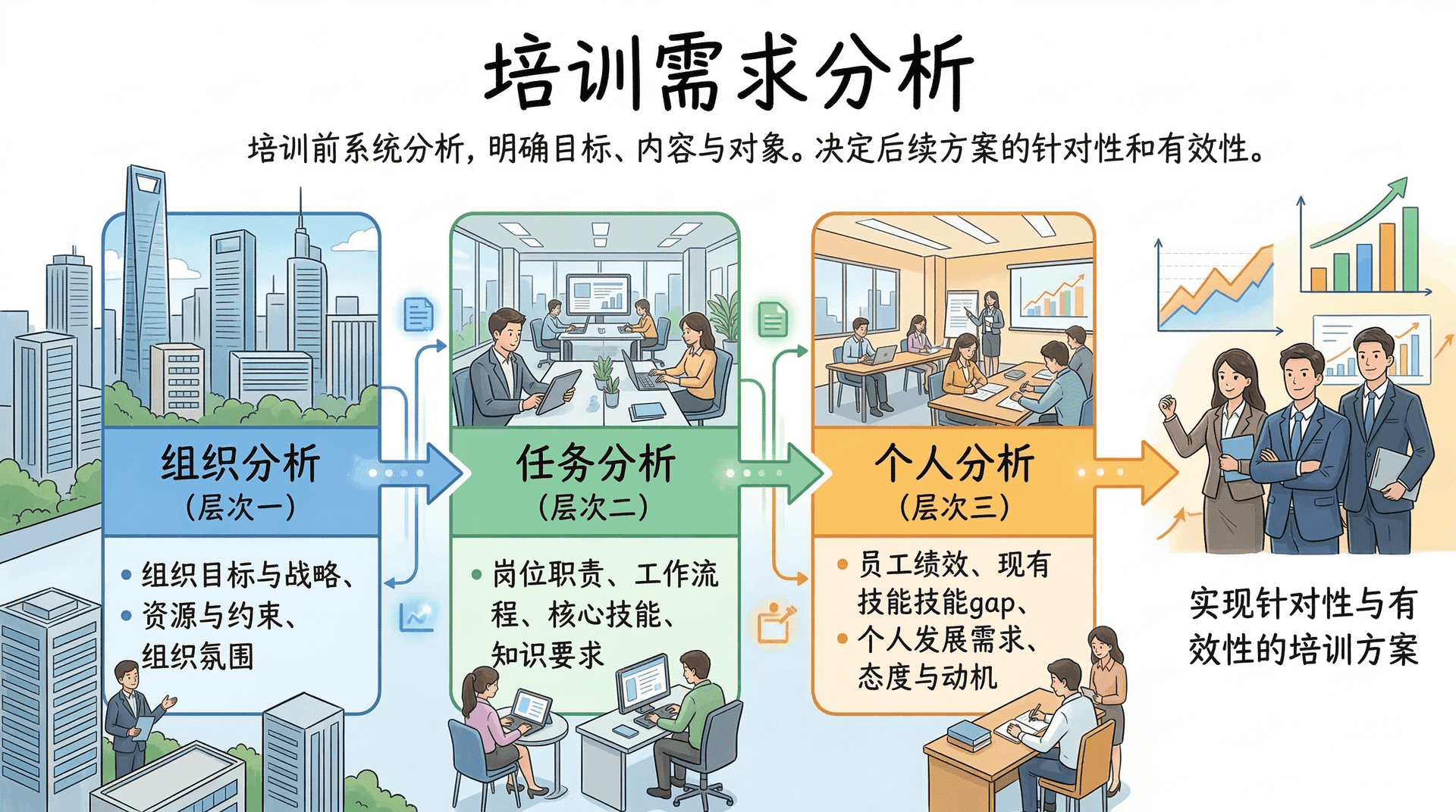 三层需求分析相互补充:组织分析从战略层面回答“为什么培训”,任务分析从岗位层面回答“培训什么”,个人分析从个体层面回答“培训谁”。只有三者结合,培训目标才能真正有依据、有方向。