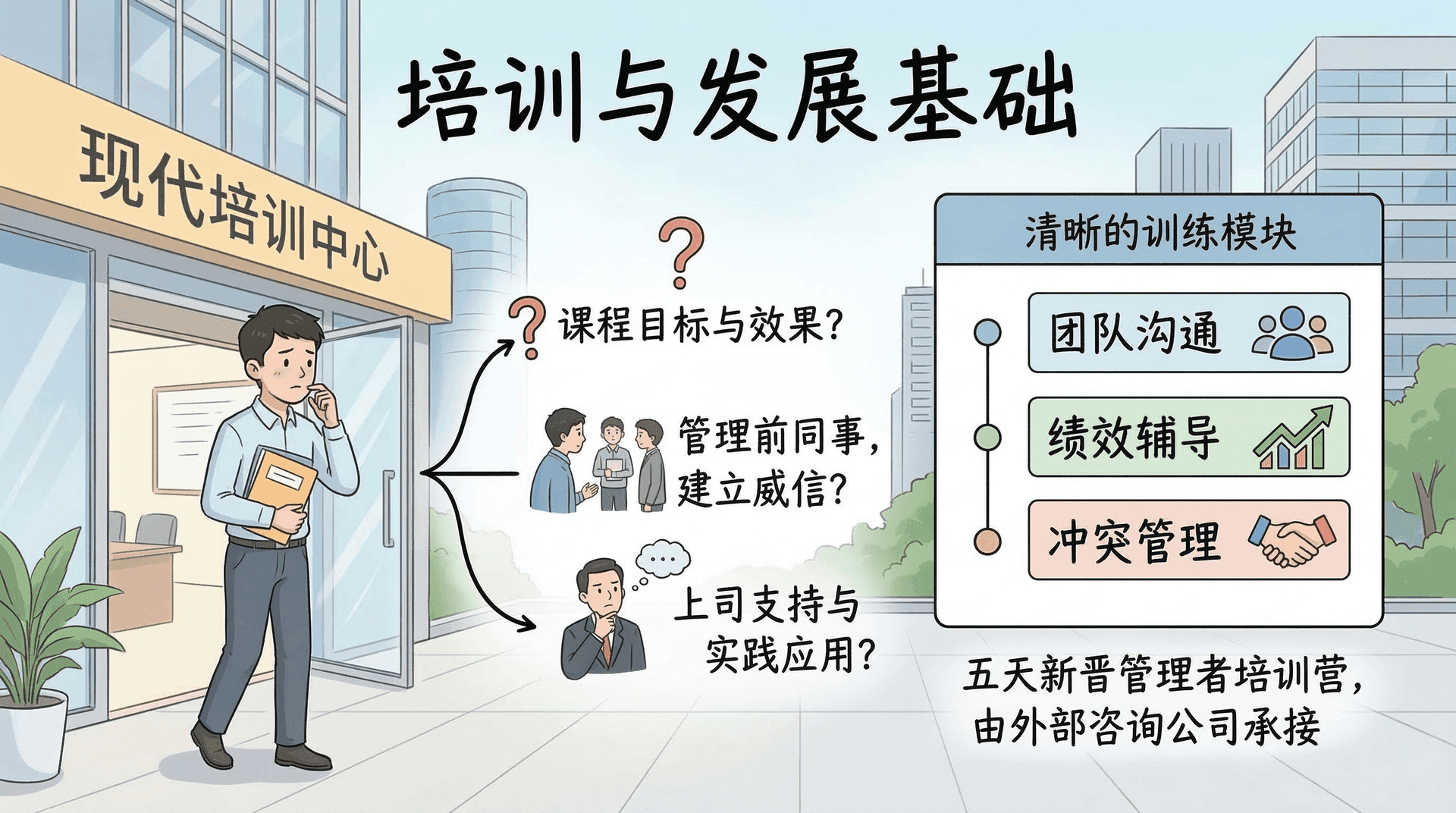某互联网公司的产品部门主管张晓刚晋升不久,公司人力资源部门安排他参加为期五天的新晋管理者培训营。训练营涵盖团队沟通、绩效辅导、冲突管理等模块,全程由外部咨询公司承接。张晓在报到当天心情复杂:不清楚课程究竟要达到什么效果,也担心前同事变成下属之后自己的威信难以建立,更不知道回到岗位后上司是否真的支持他把课上学到的东西付诸实践。