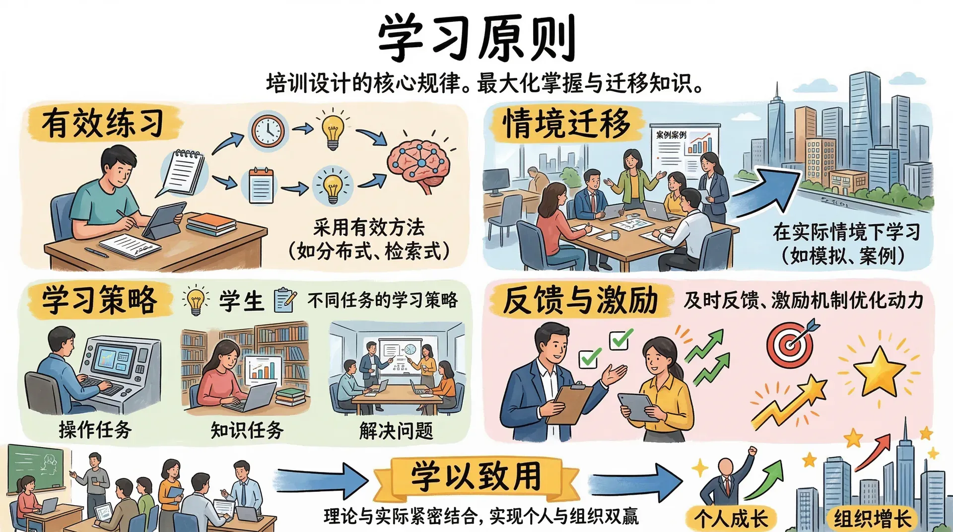 学习原则是培训设计和实施中起到指导性作用的核心规律。它们源自心理学、认知科学以及教育学的长期研究,旨在帮助学习者在有限的时间和精力内,最大化知识与技能的掌握与迁移。正确理解和应用这些原则,不仅能够提升培训的效果,还可以增强学习者的主动性、适应性和持续发展的能力。