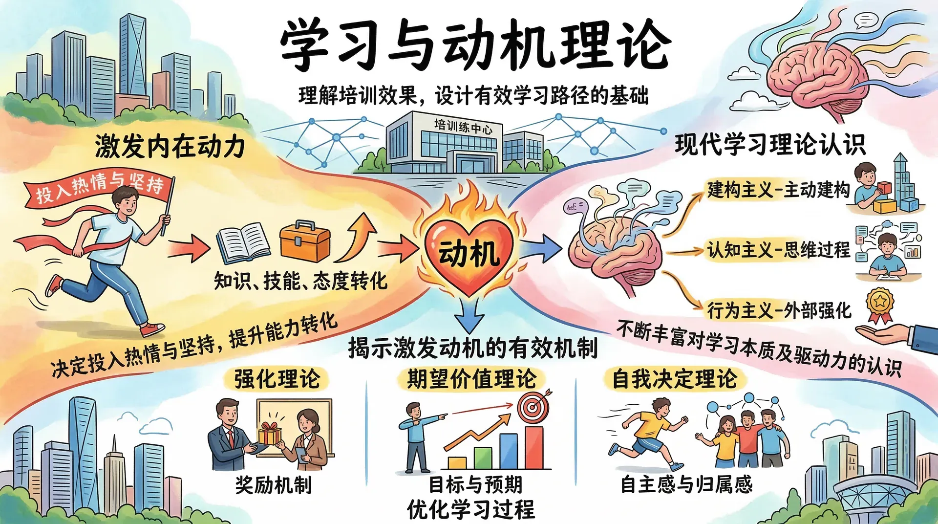 动机决定了学员面对培训时投入的热情与坚持程度,是影响学习质量与远期迁移的关键变量。现代学习理论从行为主义、认知主义到建构主义,不断丰富我们对学习本质及其驱动力的认识,各类动机理论(如强化理论、期望价值理论、自我决定理论等)则揭示了激发动机的有效机制。