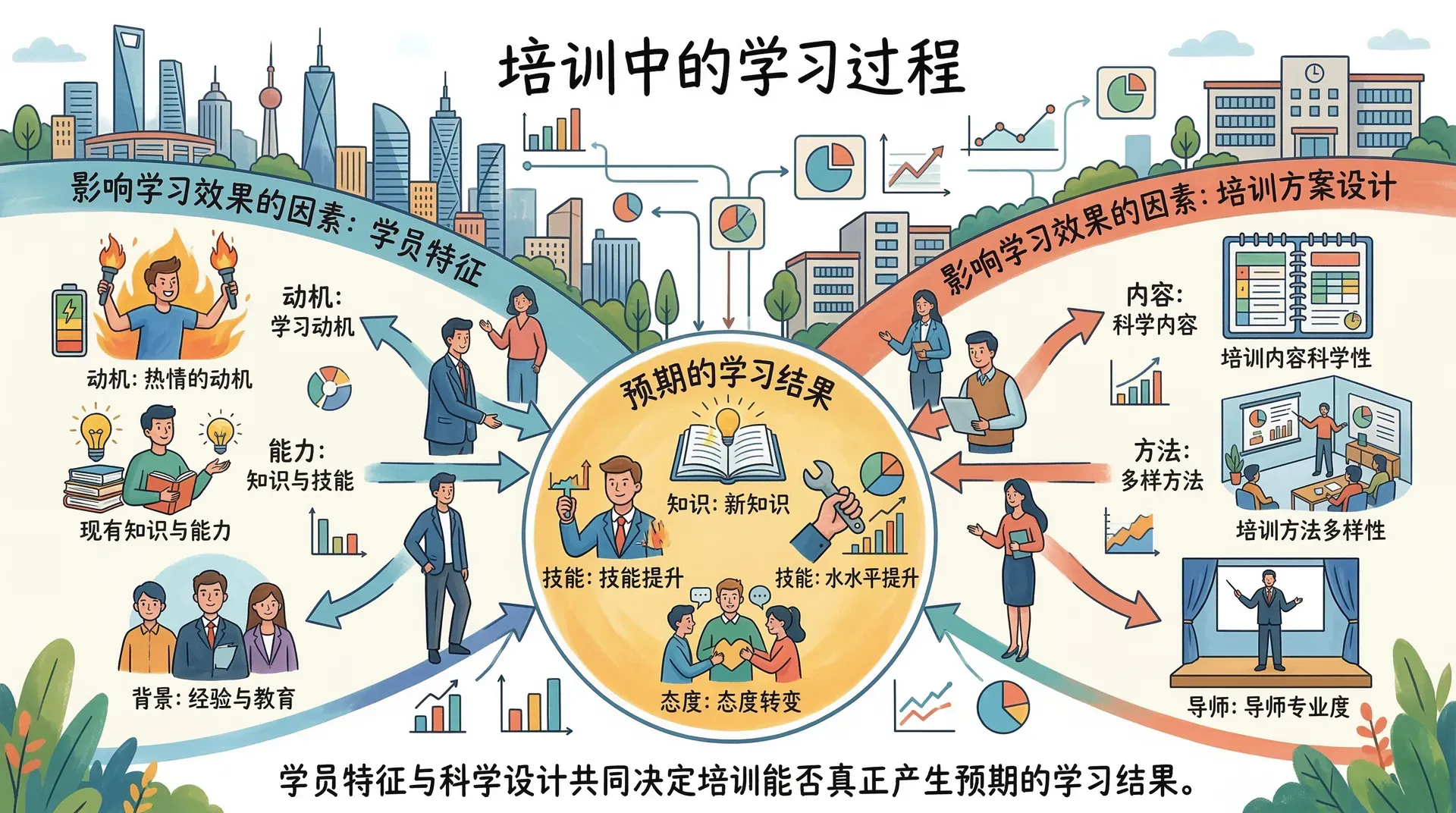 确定培训需求和目标之后,培训方案的设计需要建立在对学习发生机制的理解之上。影响学习效果的因素主要分为两类:学员自身的特征,以及培训方案的设计质量。两者共同决定了培训能否真正产生预期的学习结果。