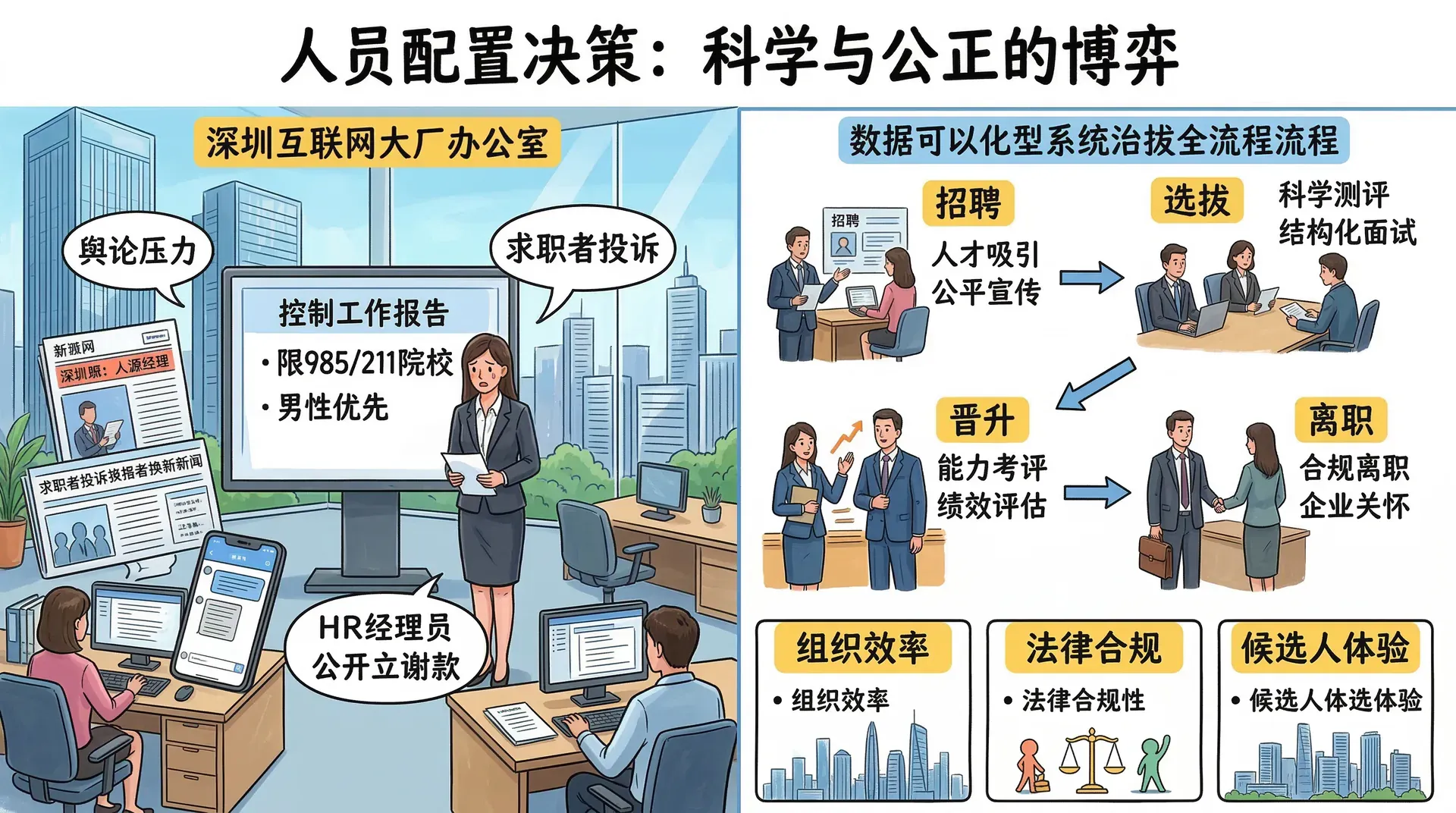 人员配置决策涵盖了从招聘、选拔、晋升到离职的整个流程,绝非简单的“招人”或“裁人”。每一个环节都牵涉到组织的运营效率、法律合规,以及候选人的切身感受。一个看似普通的面试问题,可能会埋下日后的法律隐患;一套设计粗糙的测评工具,可能会让真正有能力的人才在第一关就被淘汰。