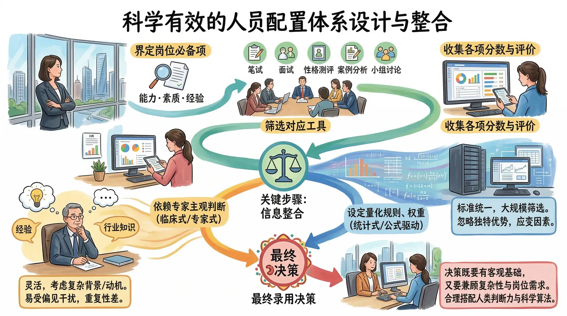 建立一套科学有效的人员配置体系,不能只关注选用哪些评估工具,更重要的是要系统性地规划整个决策流程。首先,需要界定哪些能力、素质或经验是目标岗位的“必备项”,然后筛选出可以对应测量这些要素的工具(如笔试、面试、性格测评、案例分析、小组讨论等)。不过,流程并不止步于收集各项分数和评价,更关键的是要明确——如何将这些分散的信息整合成一个最终的录用决策。