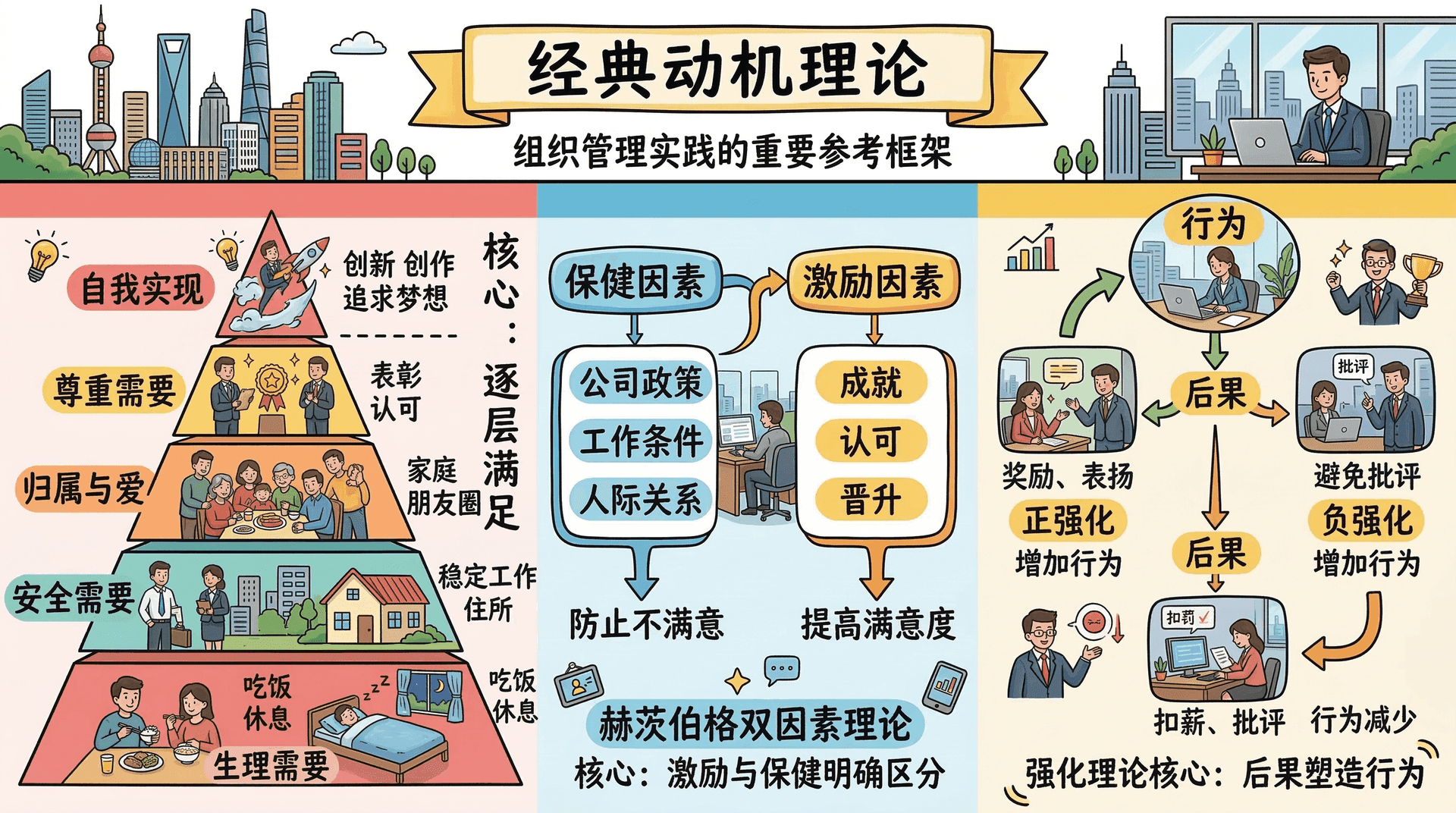 在动机研究的历史上,有几个理论对后世影响深远,至今仍是组织管理实践的重要参考框架。马斯洛的需要层次理论从人类基本需要出发,赫茨伯格的双因素理论将激励与保健明确区分,斯金纳的强化理论则把注意力完全转向行为与后果之间的关系。这三个理论分别代表了不同的理论传统,理解它们的核心主张与局限,是进入更复杂动机理论的必要基础。