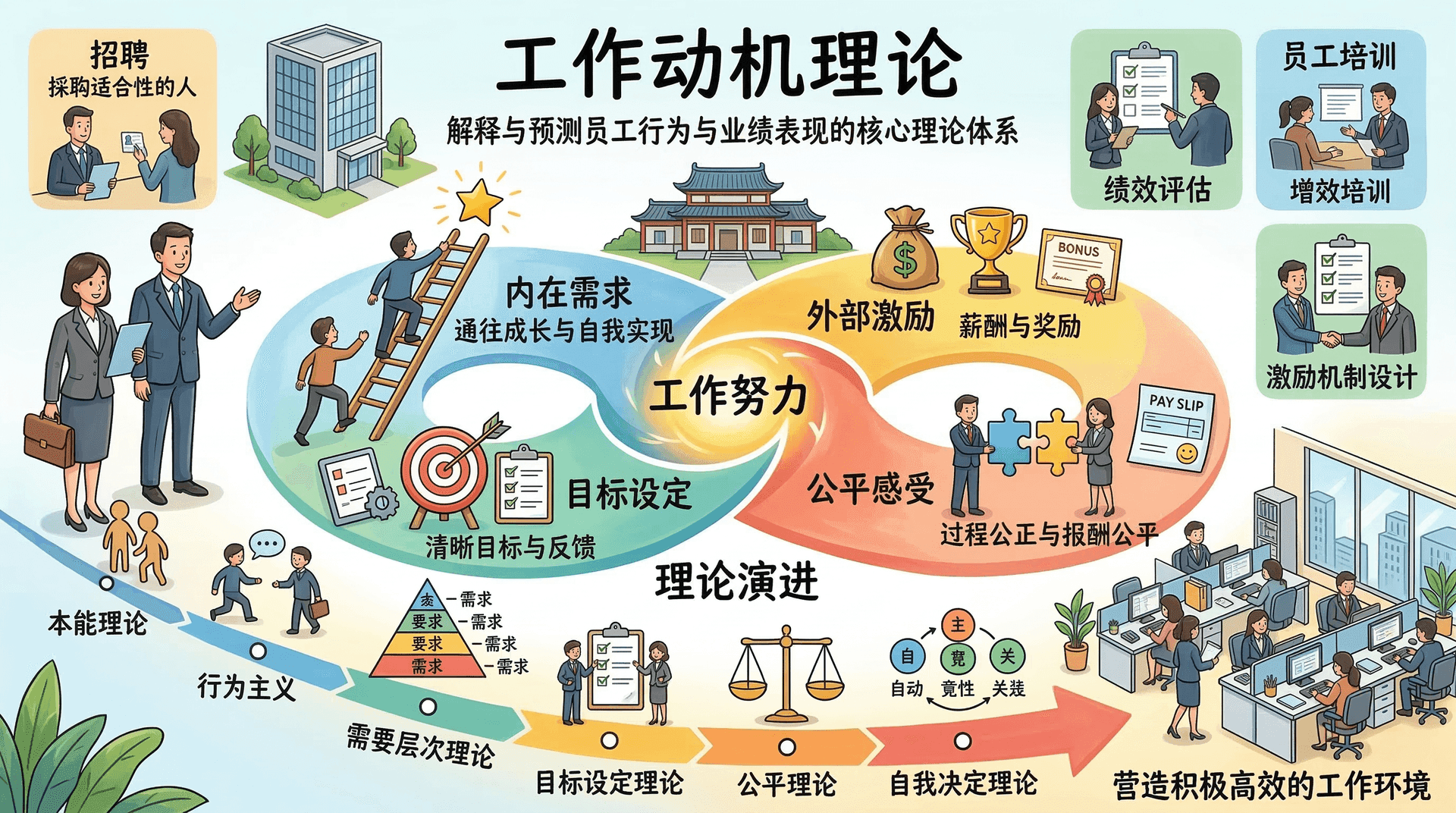 在过去一百多年里,关于工作动机的研究与理论演进推动了管理实践的发展,对招聘、员工培训、绩效评估及激励机制的设计等方面均产生了深远影响。从最早的“本能理论”到“行为主义”,再到“需要层次理论”“目标设定理论”“公平理论”“自我决定理论”等,工作动机理论见证了心理学对人类行为理解的不断深化。掌握这些理论不仅有助于我们理解员工的动机来源,还能为组织营造积极高效的工作环境提供理论基础和实践指导。