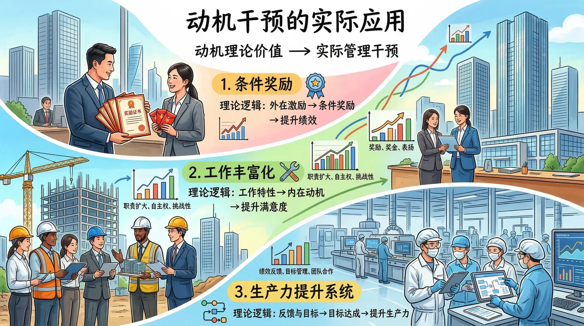 了解动机理论的价值,最终体现在能否有效地将其转化为实际的管理干预手段。组织心理学家在过去几十年中发展出了多种经过实证检验的干预方法,其中最具代表性的是条件奖励、工作丰富化和生产力提升系统。这些方法背后分别对应着不同的理论逻辑,在实践中也各有其适用的场景和边界。