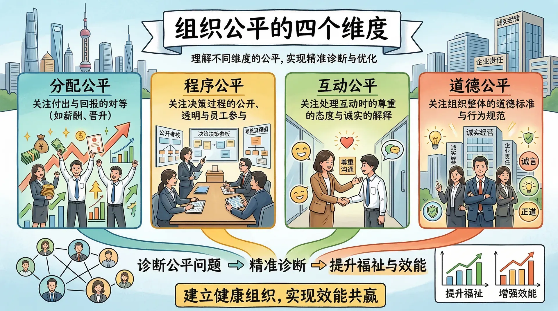 组织公平是一个多层次的概念,不同维度的公平对员工的影响方式和影响程度各有不同。目前学界普遍认可的框架将组织公平划分为四个维度:分配公平、程序公平、互动公平和道德公平。理解这四个维度,有助于管理者更准确地诊断组织中的公平问题,而不是把所有不满都归因于同一个笼统的“不公平”。