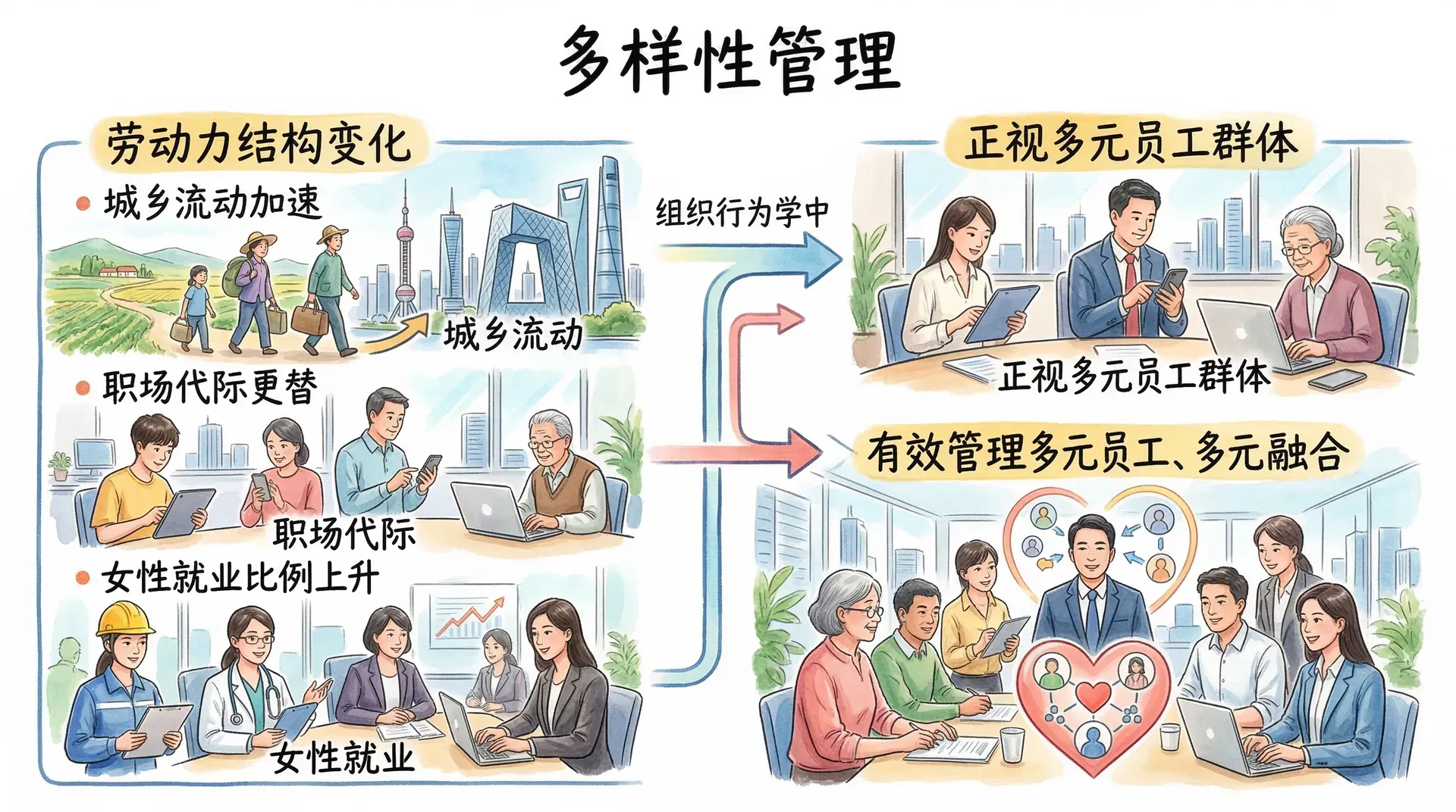 多样性管理是组织行为学中一个既有理论积累、又面临大量实践挑战的领域。随着中国劳动力结构的变化——城乡流动加速、职场代际更替、女性就业比例上升——如何在组织内部有效管理多元化的员工群体,已经成为管理者必须正视的现实课题。